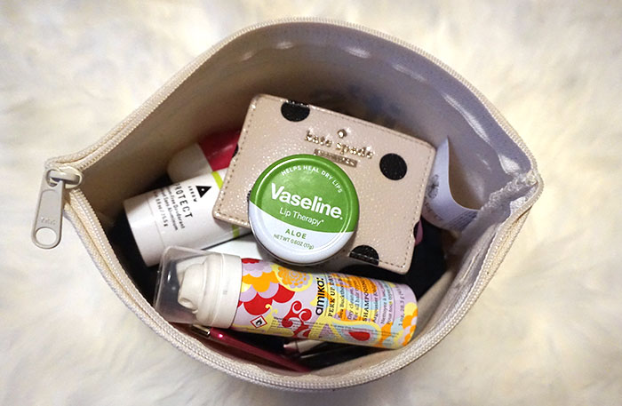 The makeup bag also fits my keys, phone and Kate Spade Card holder — which I regularly use as a wallet substitute – It holds my license, credit card, MetroCard and money without any bulk.