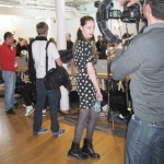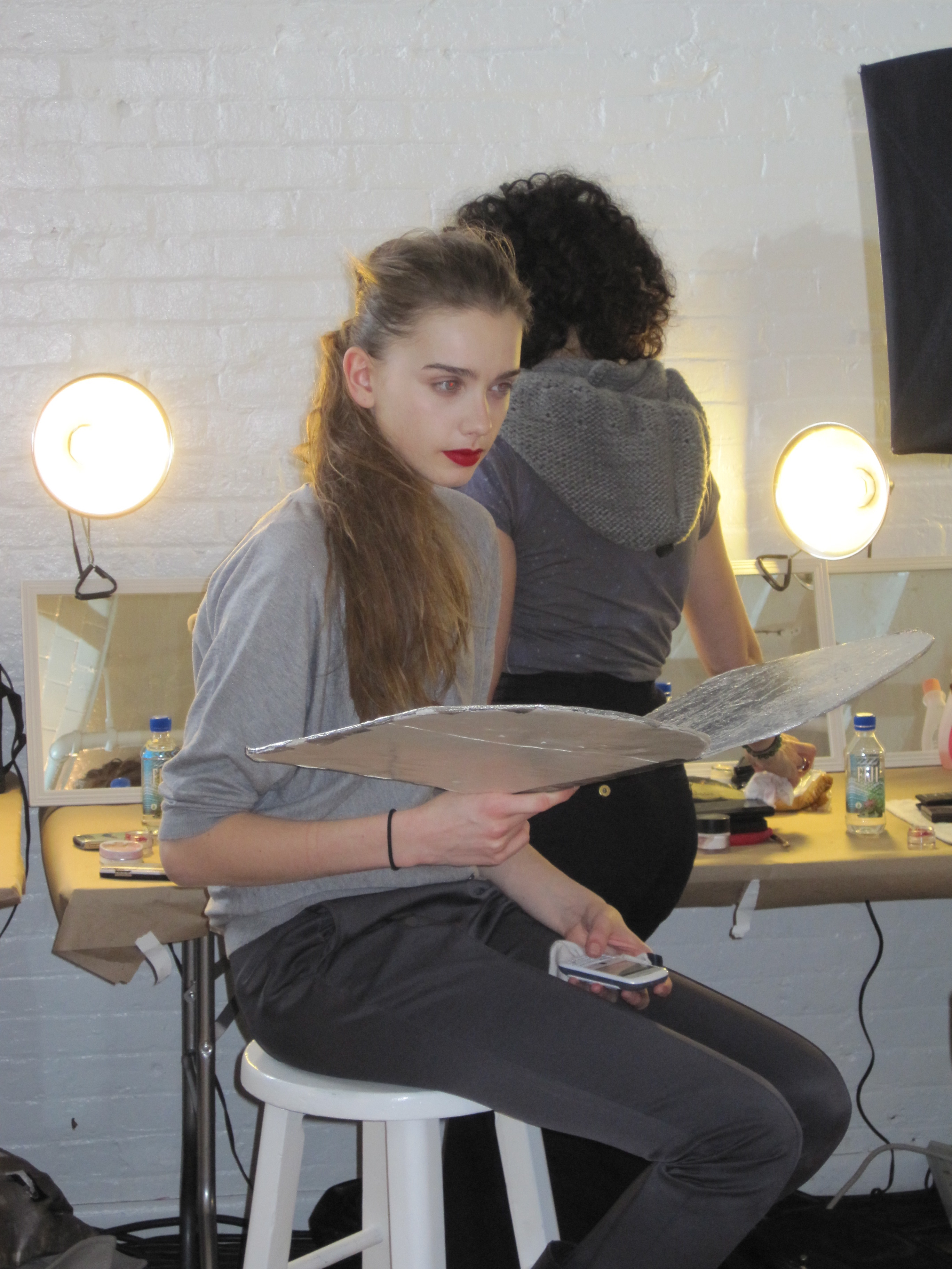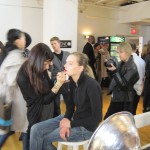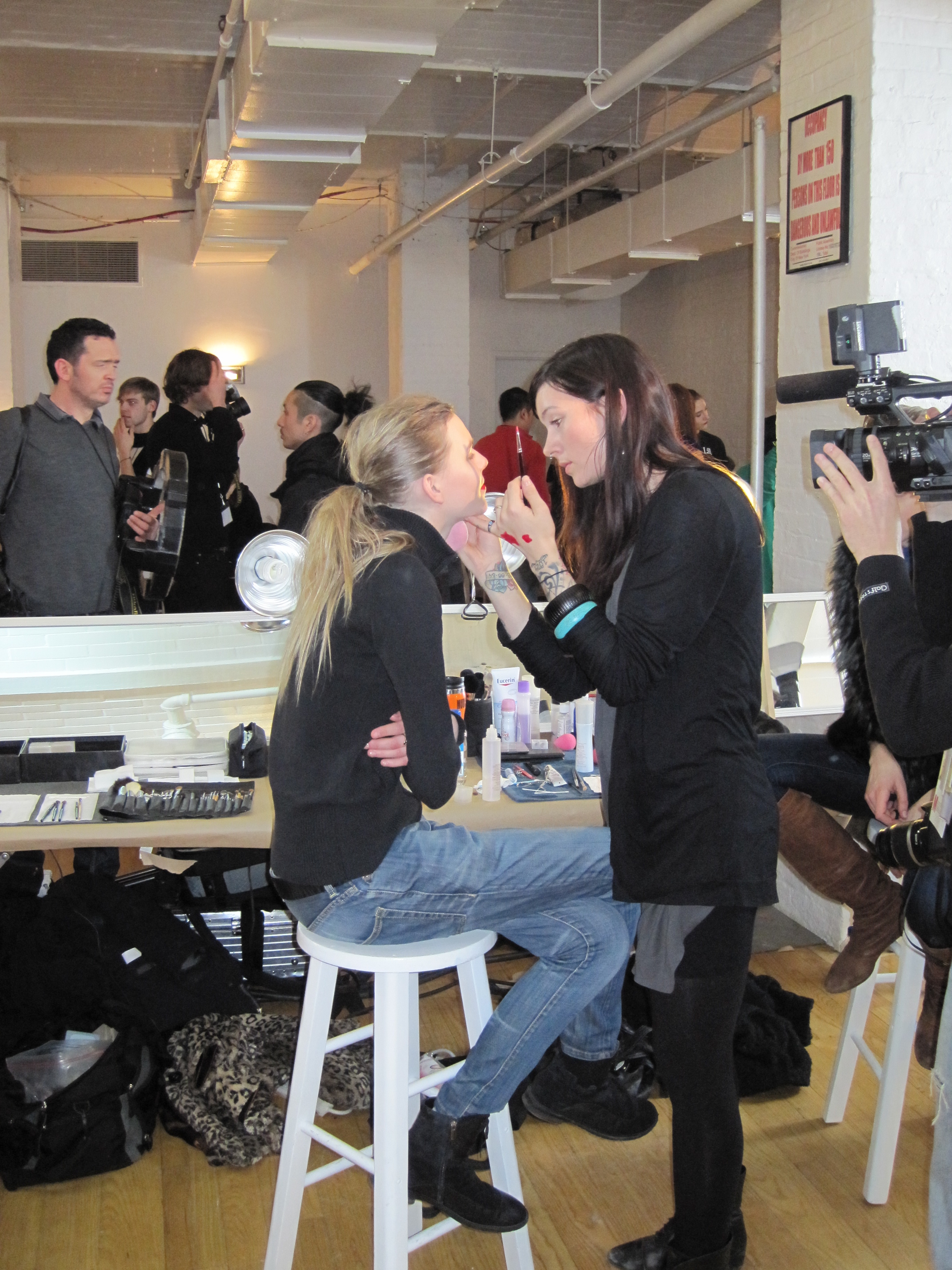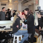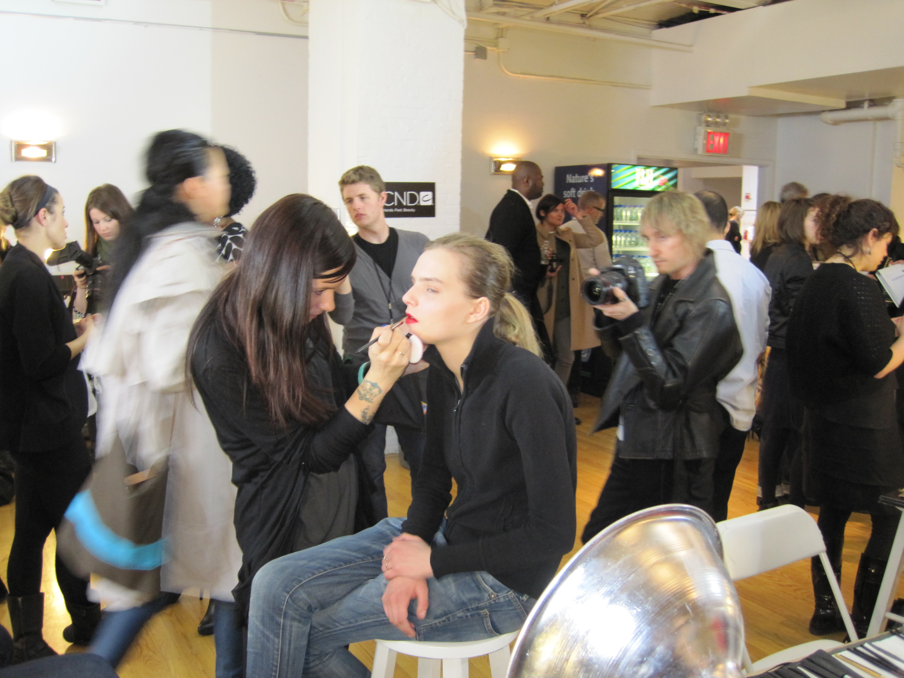Jenna Menard for Shiseido led the artistry team doing a strong, matte, red lip using Shiseido lipstick in Valentine. To keep the accent on the bold lips, Menard was minimal on the rest of the makeup, using no eyeliner and just a hint of peach shimmer around the eyes.