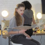 Rolando created the look by spraying Bumble and bumble ‘Thickening Hairspray’ to add volume and texture and height at the crown. Rolando recommends, “using your hands, not a brush” and to rake hair back with your fingers, then secure with a simple black elastic. Finish with Bumble and bumble’s ‘Does it All Styling Spray‘.