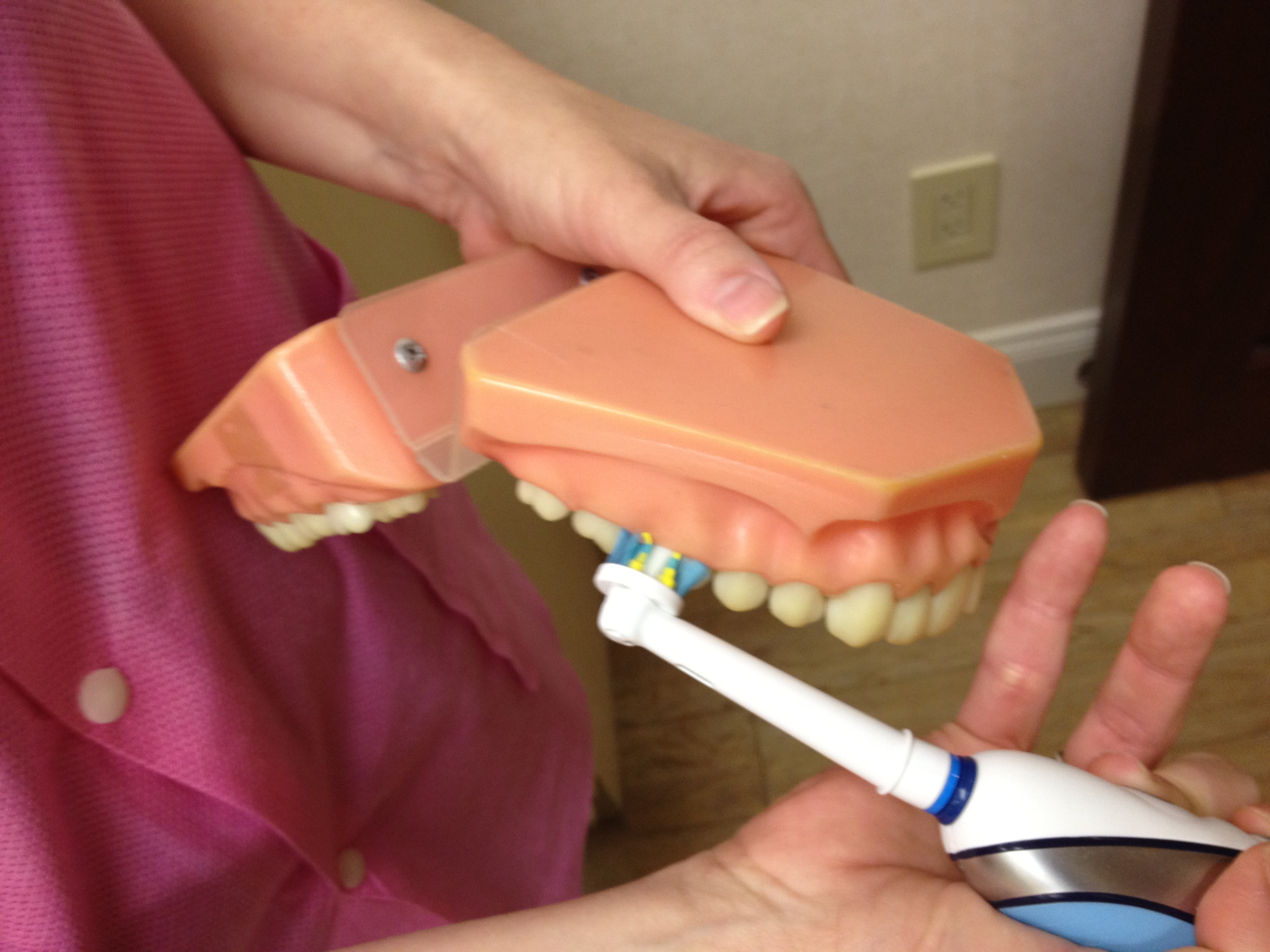 To help keep teeth healthy remember to brush twice a day (preferably with a toothpaste containing fluoride) and floss. Use a soft bristle toothbrush and brush around each tooth. For an electronic toothbrush, they recommend Oral-B Professional Care SmartSeries5000. As pictured above, rest the brush head on each tooth for 3 seconds, turn on, and the bristles take care of the brushing for you.