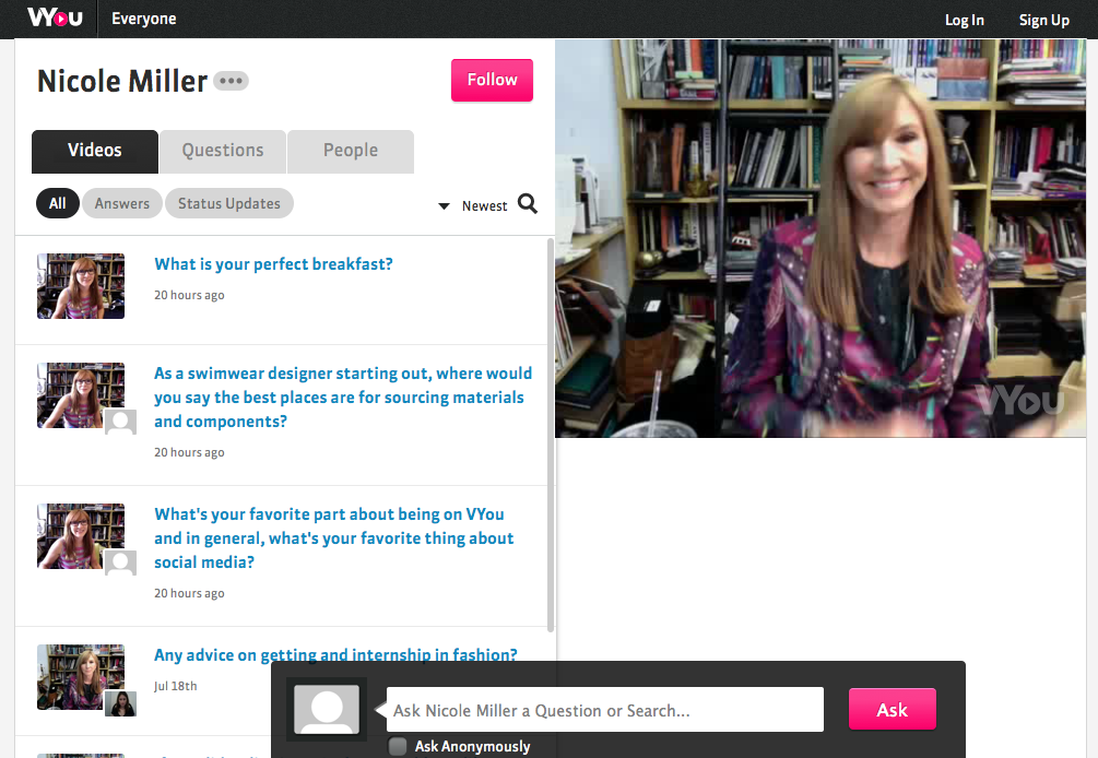 Have a question for Nicole? If so visit her channel: http://vyou.com/nicolemillernyc, type in your question and hit “ask”. Nicole will be answering selected questions from users on a weekly basis. You can also browse responses to questions that other NM fans have asked like “Any advice on getting an internship in fashion?” or “As a swimwear designer starting out, where would you say the beset places are for sourcing materials and components?”. Enjoy!