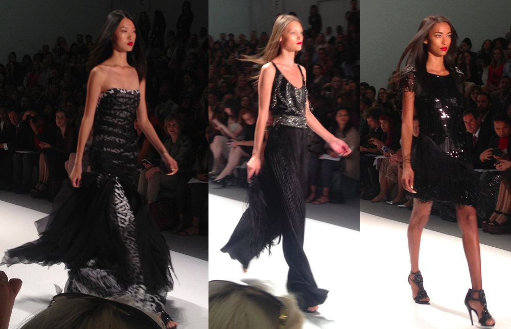 Hallucinatory jungle is evident in the variety of colorful animal prints – giraffe print in phosphate blue, a tiger skin in oxidized yellow, the zebraesque black and white combinations that take shape in soft, flowing forms. Miele explored the idea of mutation, with dense, hybrid patters that at the end of the day comes down to your personal preference. For me, the yellow tiger skin print was breathtaking (especially the long strapless dress — model wore it well), while the blue giraffe print didn’t do much for me. The collection of nudes took almost a flapper form at top only the fringe fell on the sleeves instead of the bottom and it was matched with a looser, longer drop at the hemline. I’m never big on green silk chartreuse but some of the designs changed my mind — and surprisingly they were generally paired with black/white pieces. Who would have thought?