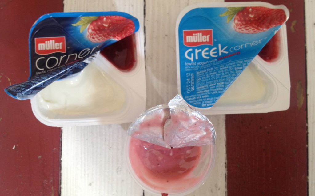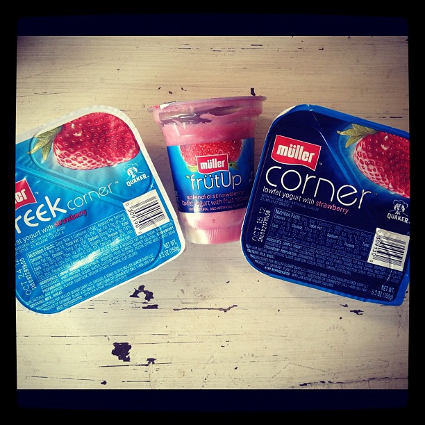 I grabbed a few different flavors of Müller™ but decided to get the FrütUp, Corner and Greek Corner all in strawberry so I could differentiate the difference in all three products. Although the Greek Corner was thicker then the regular (a common characteristic of all Greek yogurts since they are strained to remove more water from the yogurt making the consistancy firmer and creamier), it’s actually quite light and milder then the other Greek yogurts that I have tried; making the difference in flavor of the regular vs. Greek yogurt much more subtle. Especially once the jam was mixed in. The strawberry jam used was sweet and yummy, similar in taste to those individually packed jams you get at diners (you know what I’m talking about). I like that it’s separated out in a different compartments so I can control how much jam goes in. The FrutUp may have been my favorite of the three. The fruit mousse mixes really evenly and easily into the yogurt making it smooth, and airy. It’s still really sweet, but it’s probably the lightest of the three yogurts.