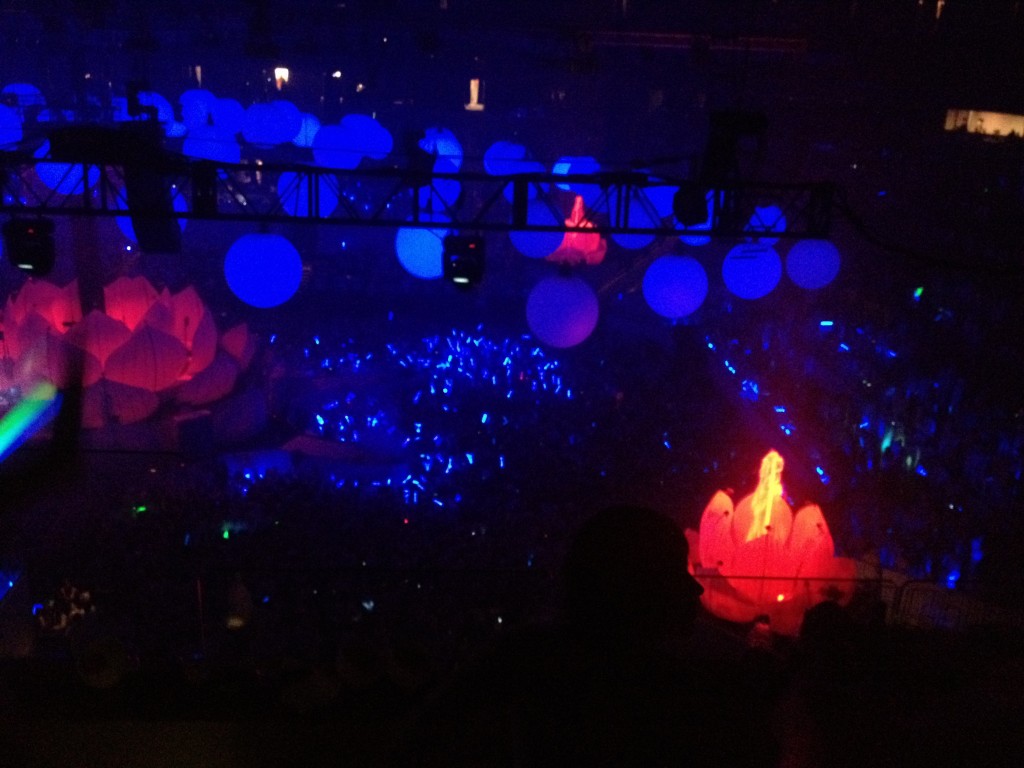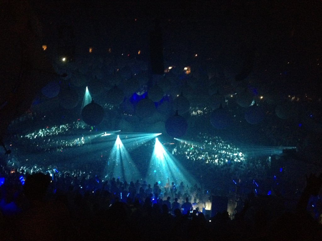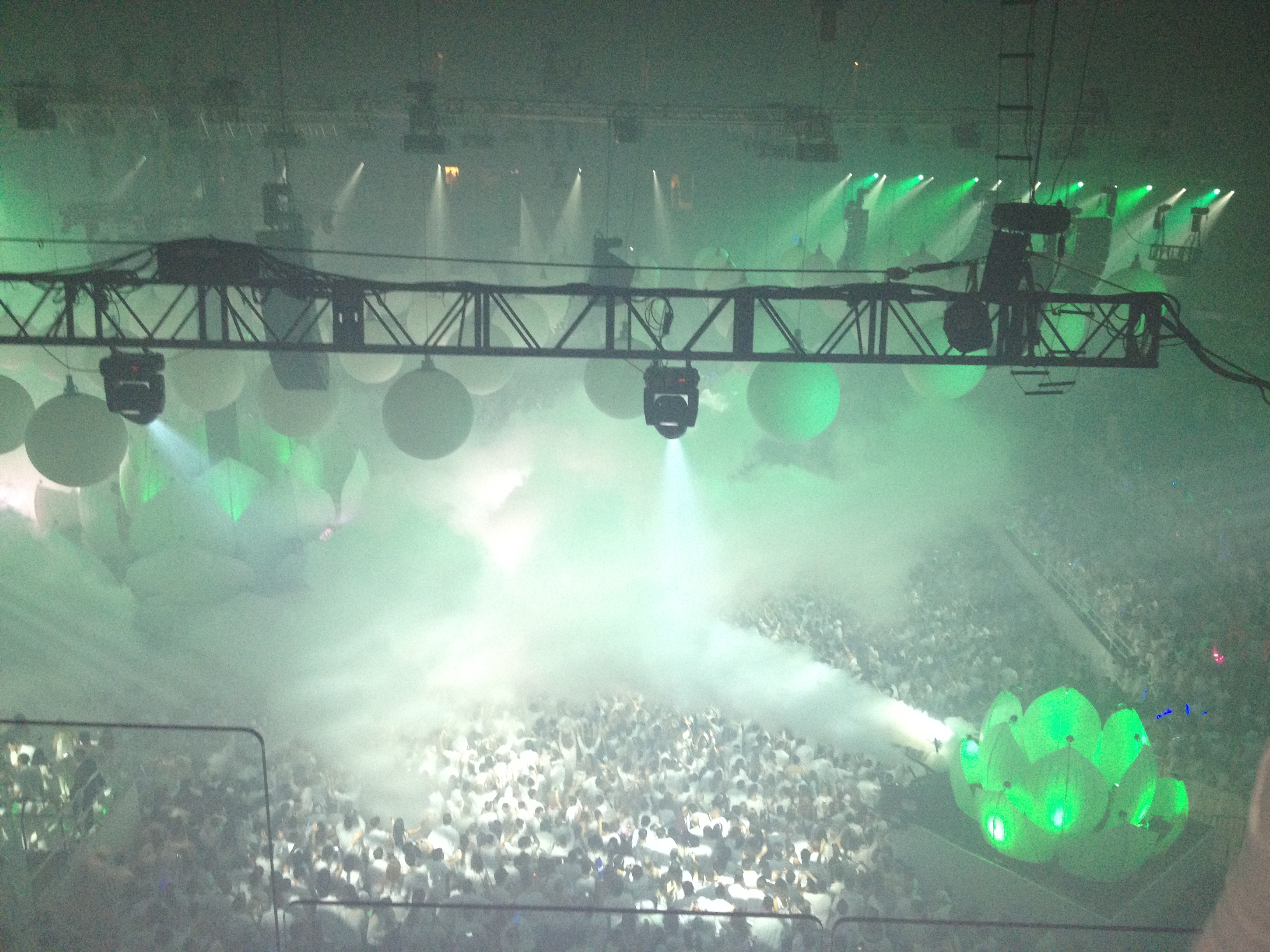 We walked onto the floor and it was this incredible view of thousands of people dancing around these lotus flower shaped fountains and DJ booth. You can see the theme of different elements pouring through the stadium.