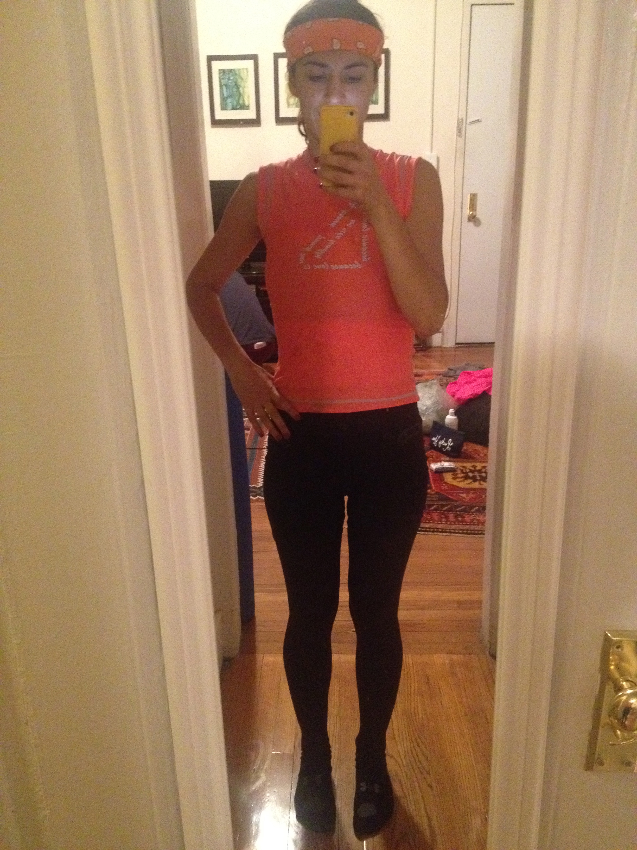 {I wore an Under Armour Seamless Essential Sports Bra, Roxy surf rashguard top, Hanes Blackout Silk Reflections Convert-A-Tight and Under Armour The Grippy II No Show Socks and Nike sneakers I was content with retiring upon finishing.}