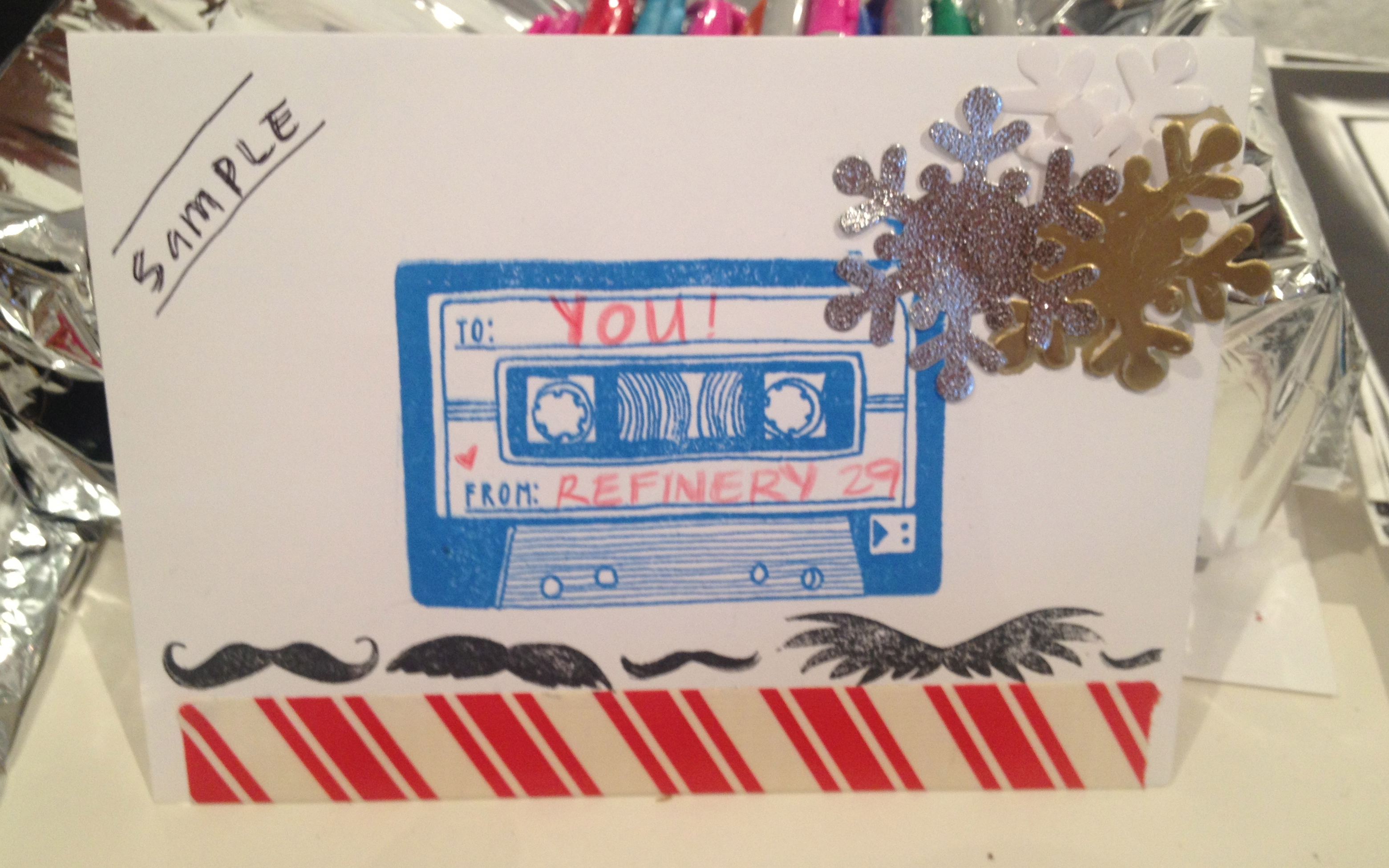 Last night, I hosted the DIY station for Refiner29’s pop-up shop, Tinseltown and had guests make and decorate their own holiday cards using Sarah Reynolds signature frame stationary.