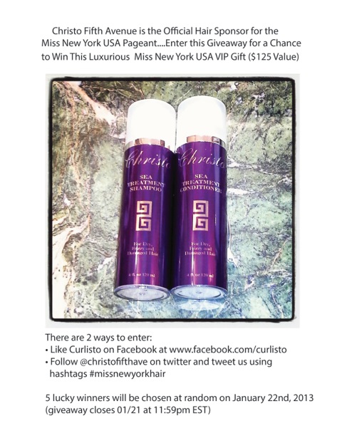 Tweet along with the competition! Christo Fifth Avenue, the official hair sponsor of the pageant is offering readers a chance to win the Christo Sea Treatment Shampoo & Sea Treatment Conditioner (value of $125). TO ENTER: “Like” Curlisto on Facebook at Facebook.com/Curlisto OR follow @ChristoFifthAve and tweet your favorite part of the pageant using the hashtag #missnewyorkhair. 5 winners will be chosen at random on January 22nd.