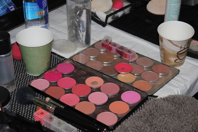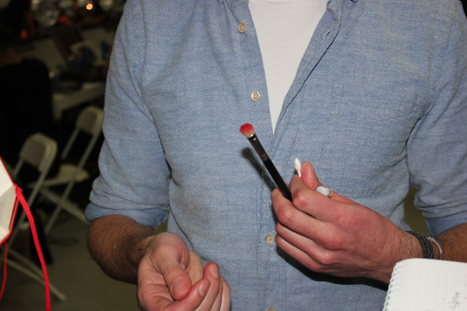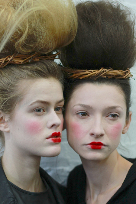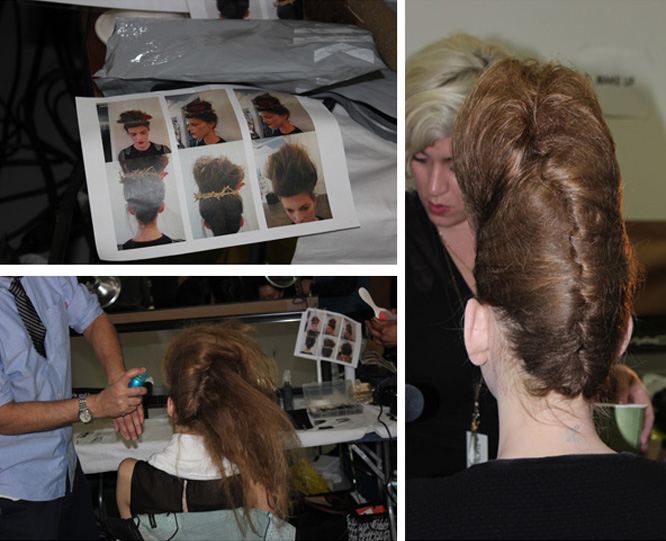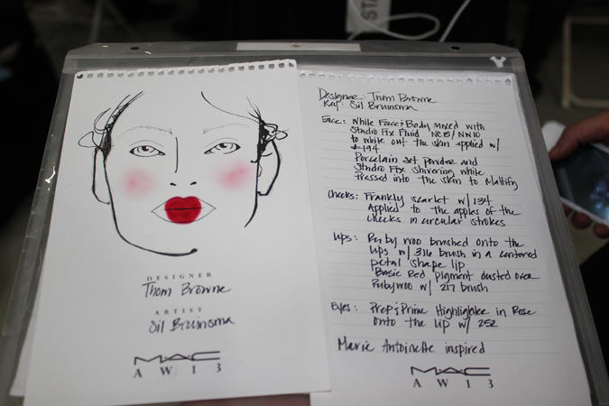 The third floor of Center 548 could have been mistaken for the dressing rooms of a major theatrical production… or maybe that’s exactly what it was. On one side of an intensely long arrangement of tables was the Bumble and Bumble hair station where fine tooth combs went up and down in harmony building levels of volume that would make Marie Antoinette heights look tame. Across the row, faces were going pale, pretty much porcelain, by an army of MAC make up artists being lead by Sil Bruinsma. Sil took a minute to explain how the look came about for Thom Browne‘s regal collection and the basis was fantasy. An enchanted look of whimsy, coyly resembling Tim Burton’s Queen of Hearts making sure to not skimp on the drama. With the apples of the cheeks slightly flushed in perfect circles by way of Frankly Scarlet it gave each model a doll like innocence that worked well with the dark scene set for the runway. The true mastery was on the lips where Sil went into great detail explaining that it was not only MAC’s fan favorite shade of red Ruby Woo that made the magic, the art was in the application using the #316 lip brush to paint the pigment in a petal like shape. The look came across every inch as imaginative as Sil described and it reeked with passion which complemented Browne’s garments like a dream.