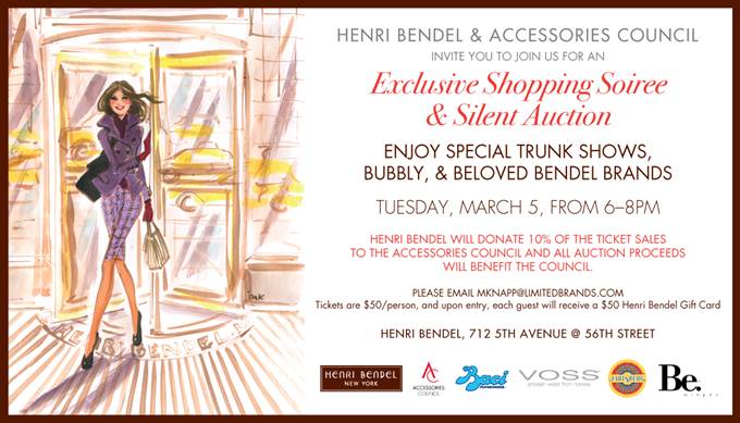 If you’re free tonight (March 5th) from 6-8pm, Henri Bendel and the Accessories Council are hosting an Exclusive Shopping Soiree & Silent Auction. Enjoy a special trunk show, bubbly, and beloved Bendel brands. (Just read the invite, I’m basically reiterating it). Tickets are $50/person, and includes a $50 gift card — plus 10% of the ticket sales and all auction proceeds will benefit the council.