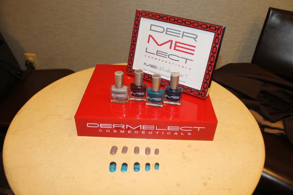 For nails, Vosovic collaborated with Dermelect Cosmeceuticals, on their new line ME, the first peptide-infused anti-aging nail lacquer. Celebrity Nail Tech Elle and manicurist Rose Velez lead the show creating two nail looks: 1) a bold ombre using shades of teal and navy, 2) a mushroom shade, topped with gold striping tape.