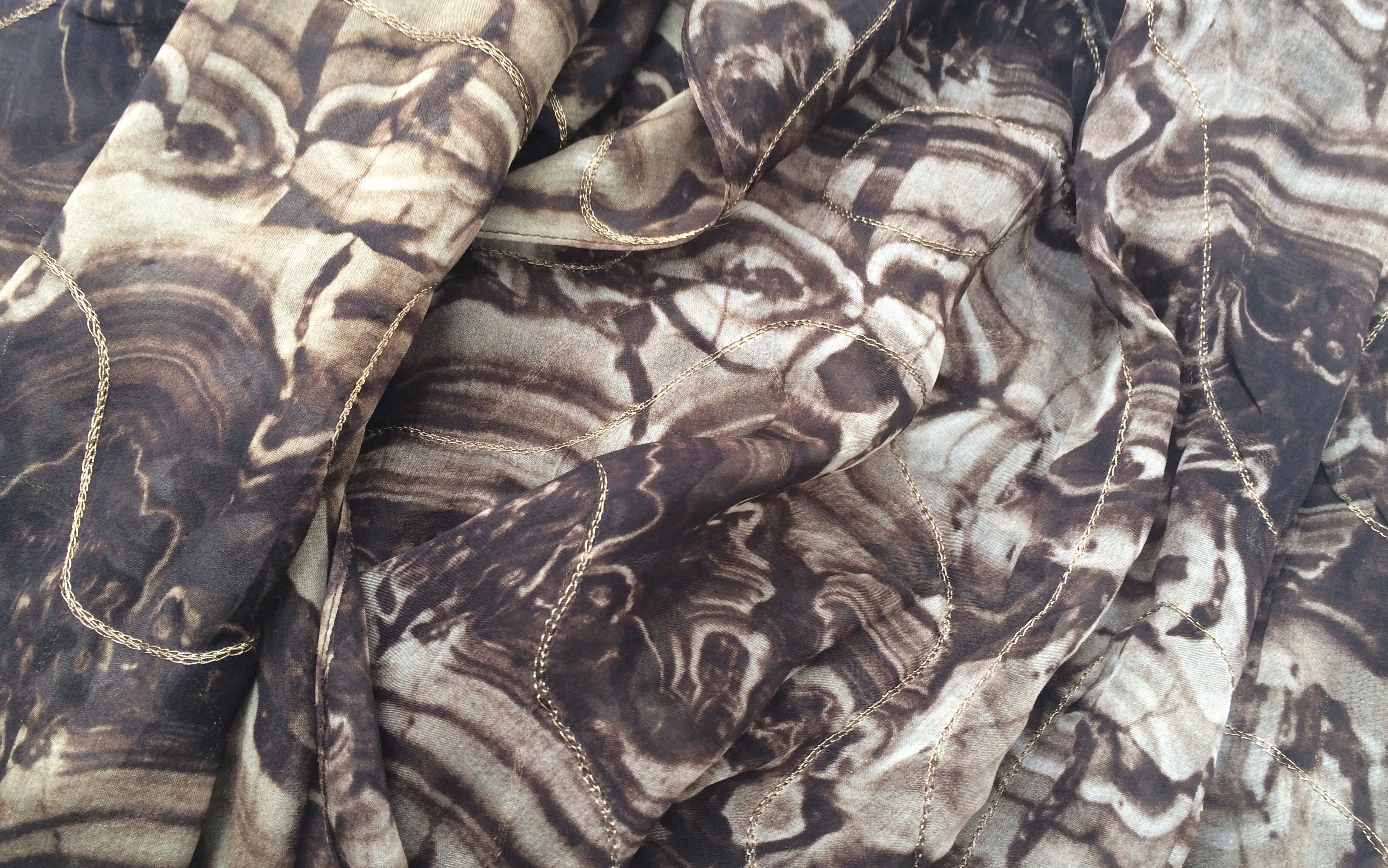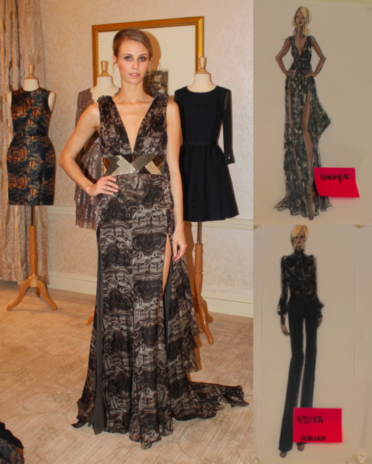 Since first meeting fashion designer, Fotini at her design studio in NYC, I have been completely enamored with her designs — and prints! For spring her collection was very feminine and pretty with soft, floral tones and elements of lace and then for fall she kept the feminine silhouette but added in a whole level of sexiness and mystery that’s beyond. And as part of her fall collection she created a custom Romanov print which was used as part of a gown (pictured below). She also used the silk chiffon print to create a limited edition scarf ($275 value), that I’m wearing in the photo above and am so excited to give away! It’s so limited, it’s not even on her site! Tie it, wrap it, it can be worn in multiple ways. It’s actually quite long (I’ve wrapped it around several times) and so elegant, that even matched with a basic white tank and jeans, it can make (and glam up) any outfit.