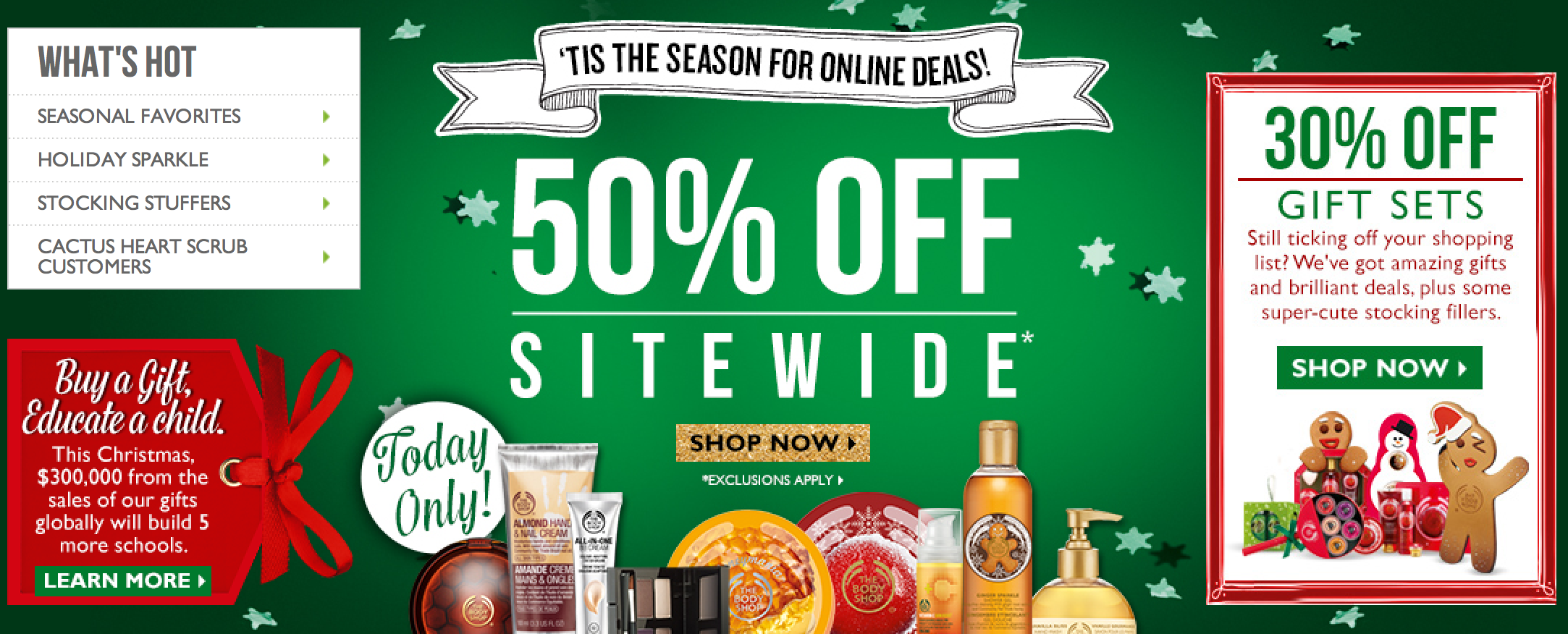 And get this! Today only shop TheBodyShop.com and get 50% off Honeymania products. There are even some great gift sets available if your looking for last minute holiday present, and this Holiday season $300,000 from the sales of The Body Shop global gifts will build 5 schools!