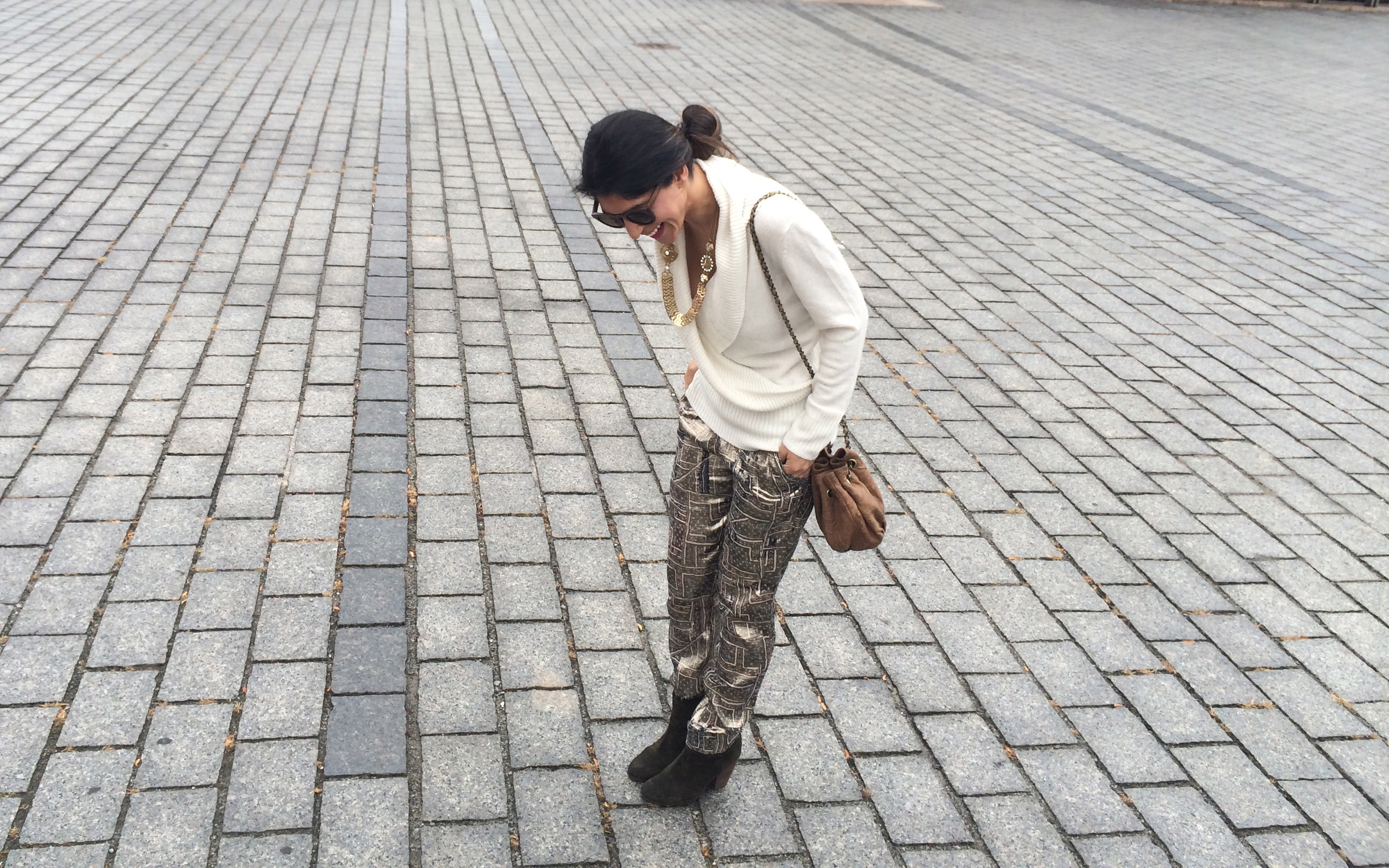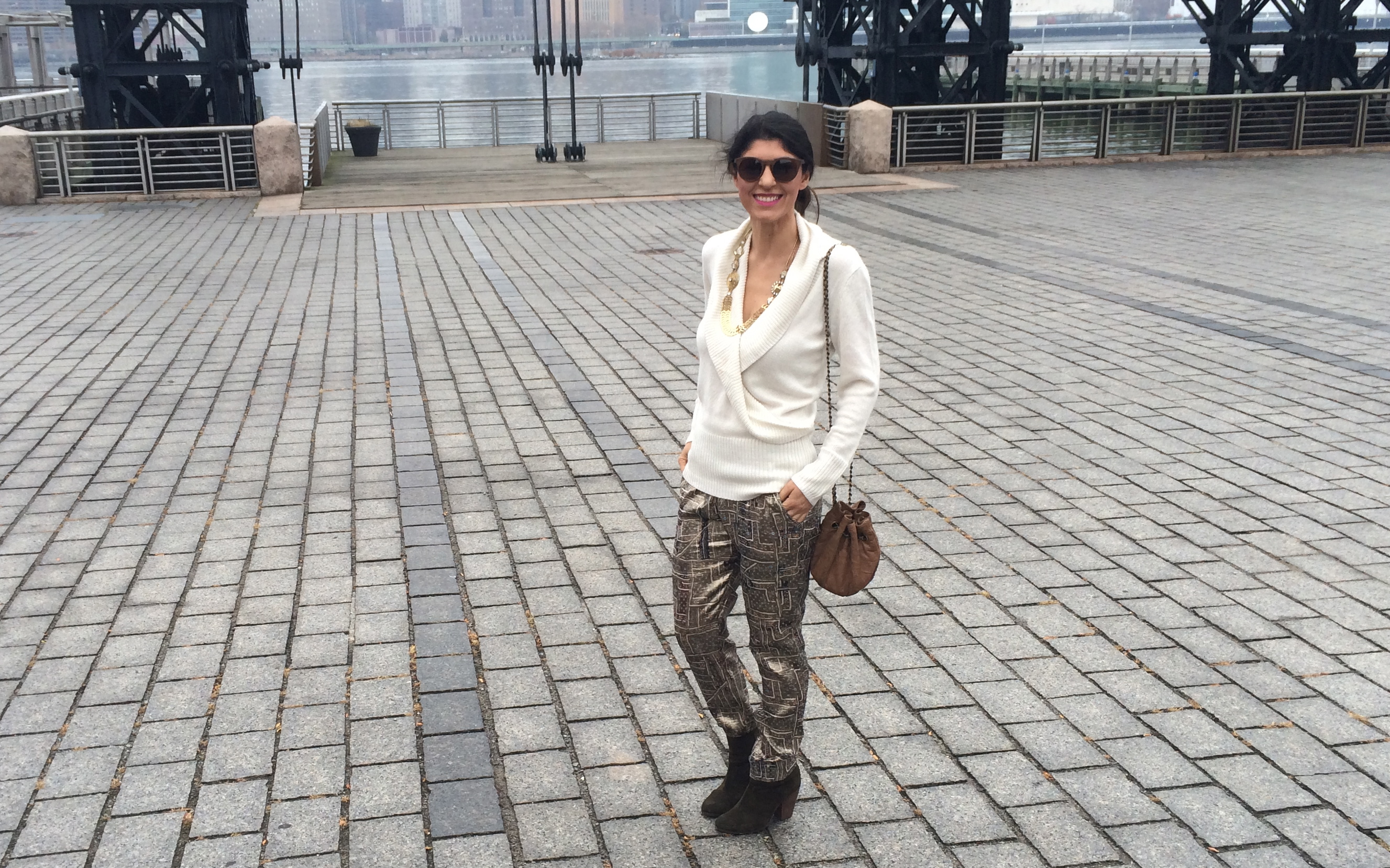 {Top c/o Sofia by Sofia Vergara Faux Wrap Sweater ($29.99, on sale $17.59) | Pants: Isabel Marant for H&M Metallic Pants ($99/sold out) | Shoes: Rag & Bone Suede Classic Newbury ($495) | Necklace c/o Erickson Beamon Rocks (similar necklace HERE) | Sunglasses: Limon Understate Brown Polarized glasses ($95) c/o WOOED | Bag: SHIH (no longer available)}