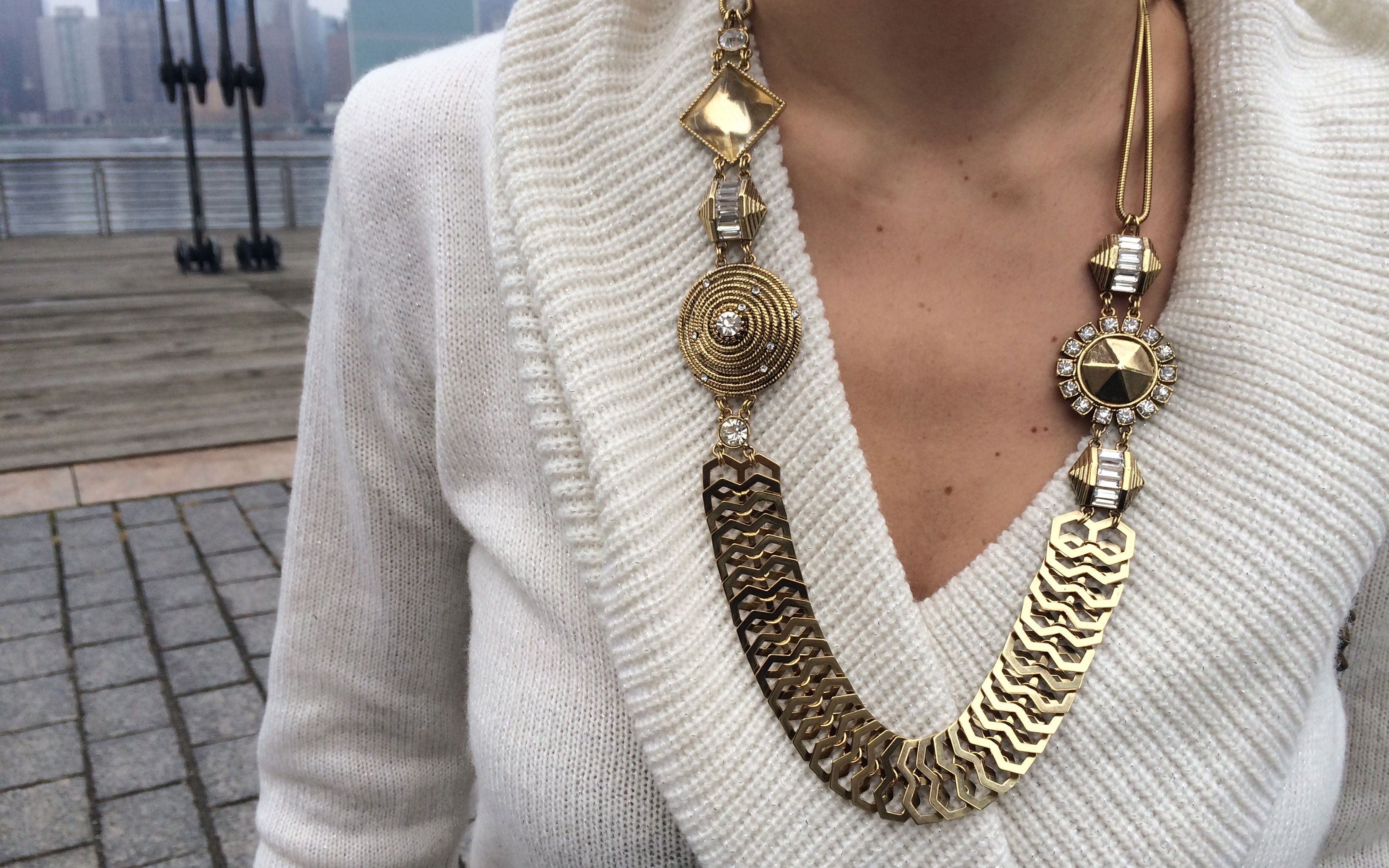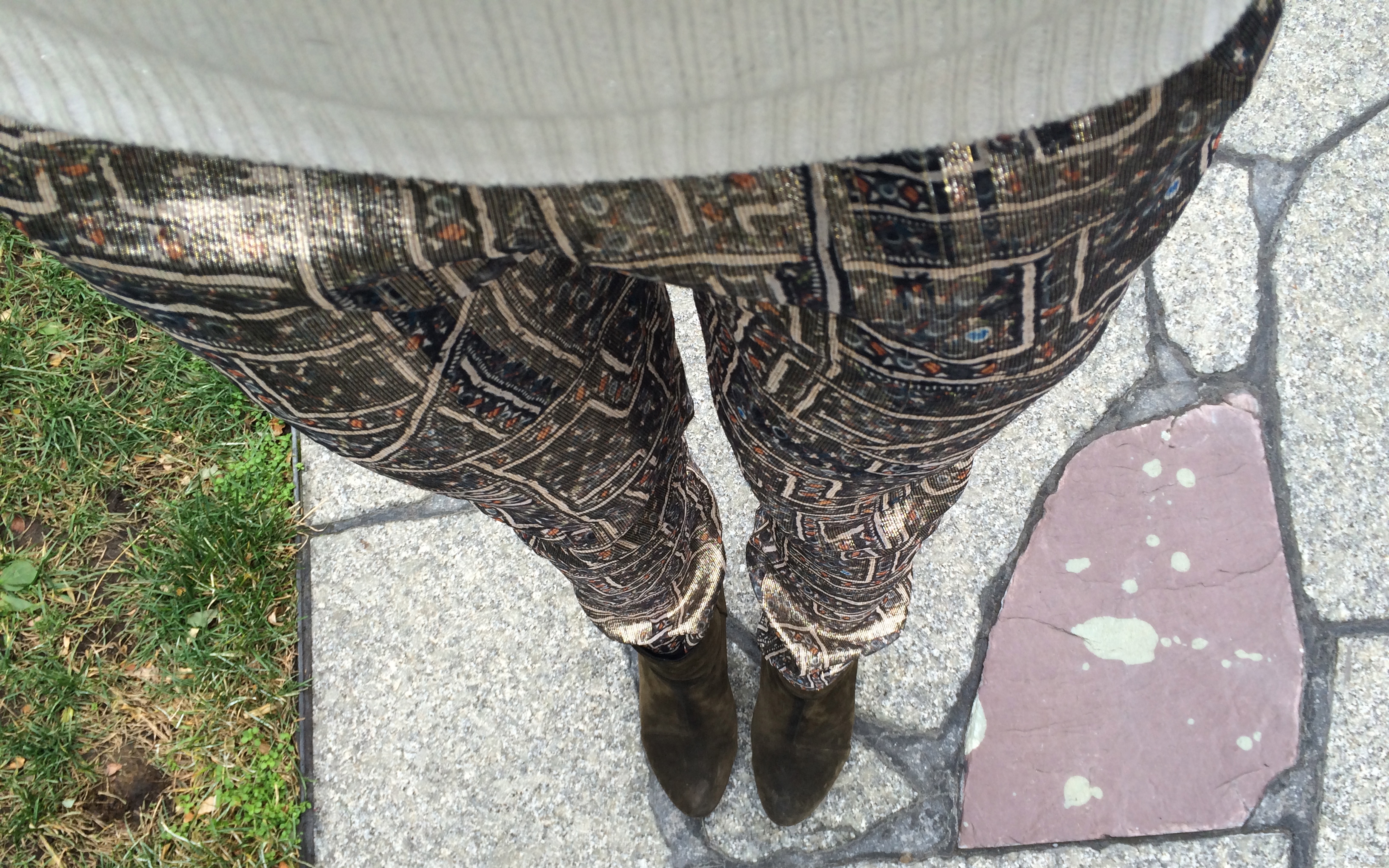 As you can tell I’m still on my mixing textures with prints kick. A nice easy knit helps balance my statement pants and my new Erickson Beamon Rocks necklace brings out the metallic in the pants.