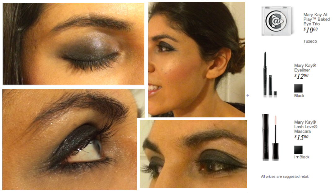 Step 2: Using the Mary Kay At Play™ Baked Eye Trio in Tuxedo ($10) apply the white shade to the top of your eye lid, followed by the silver/gray shade shade in the crease and extended in part to the eye lid. Then complete the rest of the eye lid using the black.