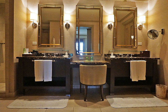 We stayed in the Verplank Suite in the North Villa building which overlooks the 18th hole of the TPC Four Seasons Las Colinas golf course and lake. Our room residence was 2,100 sq. ft which is bigger then my apt in NYC and featured three balconies, stone fireplace and dining room that seats 14 (which I like to call the board room). The best part, the bathrooms! There’s two. The master bathroom is all marble with a tub you could bathe in for days. The other a mere powder room at the entrance.