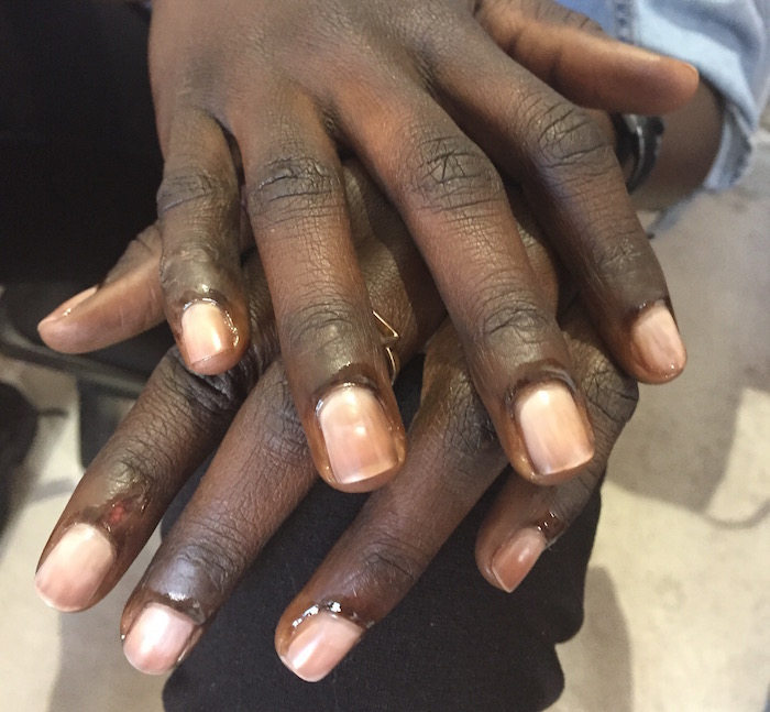 For the nails, Nonie Crème used her Colour Prevails nail polish collection explaining that the goal for the nail look was to create a buff nail without actually buffing the nail. Mannequin Hands CC Crème Basecoat was applied to the nail then two coats of Wallflower sealed the nail and was topped off with Lacquer Locker Top Coat. Layering each coat created a smooth shiny satin finish that mimics a buffed nail