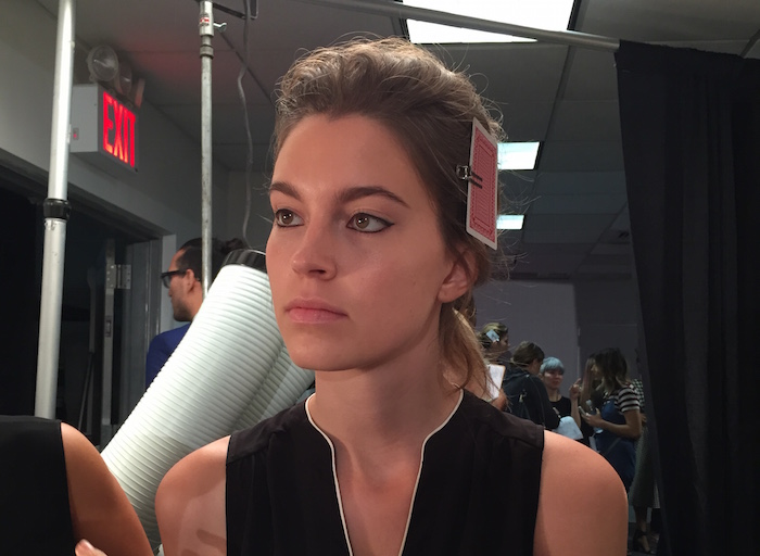 No one does pretty quite like Lela Rose, and her S/S 2016 beauty looks are nothing short of stunning. Although the core of the look radiates sweetness, a little edge keeps it from going saccharine. Using all Kevyn Aucoin products, Romy Soleimani for beauty.com led the artistry team creating a dewey and natural look with an emphasis on the eye. A light pink, glossy lip and a healthy, glowing face sets the tone. But the statement is the tight black cat eye that brings a dose of sexiness to the runway. “It never goes out of style,” says Soleimani. “We’re doing quite a minimal cat eye, it’s a tight line on top and bottom.” The minimalism of the rest of the pallet emphasizes the cat eye further. The models wear no mascara, and no blush, just some light gloss on the lips and rose gold highlight on the cheeks.