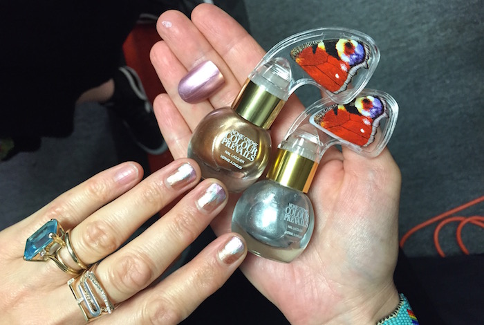 Picking up on the warm glow of the makeup, Nonie Creme created a warm metallic look using her Colour Prevails collection to create pretty colors in a powerful pattern. She started with a base of Colour Prevails “Date Night,” which is a beautiful rose gold metallic and then adds a splattered silver tip with Colour Prevails Party Girl. Instead of clashing, the tones mix together harmoniously to create an eye-catching look. When demonstrating the splatter technique, Creme dabs a thin, jagged line of polish onto the tip of the nail. It’s a light, fast gesture that creates a casual chic look of the “I just threw this on” quality. Creme’s pro tip is to dilute the base metallic with half a bottle of clear polish. “When you dilute a metallic it turns into kind of a shimmer,” she said, “It’s very beautiful.”