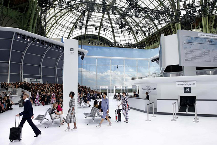 Daddy Karl Lagerfeld just upped the airport style ante, turning the Grand Palais into a life-size Chanel Airlines terminal.