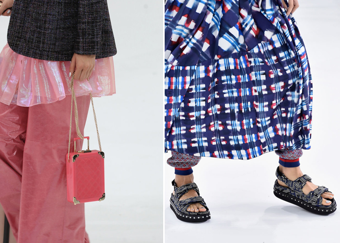 The front-runner pieces from the show were the chunky “birkinstock-like” sandals with flight path lights and the padded wheel carry-on suitcases. I use the term front-runner loosely for the sandals, meaning they were the most Instagram-worthy pieces and not necessarily the most glamorous footwear. Far be it for me to judge Daddy’s genius but when I chase a laser pointer, I was not insinuating he should incorporate it into his next designs. Pardon Daddy but we will agree to disagree on socks and sandals.