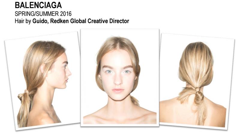 “It’s a very simple, minimalistic look at Balenciaga this season, but still very modern and fresh. I really wanted the focus of the hair to be this very smooth, beautiful texture, so I blow-dried the hair using Redken’s glow dry and satinwear 02 to create that silky, luxurious feeling. Then, I simply pulled the hair back into very loose, low ponytail that’s sort-of falling out and tucked the hair behind the ears for a sense of ease and effortlessness.” – Guido