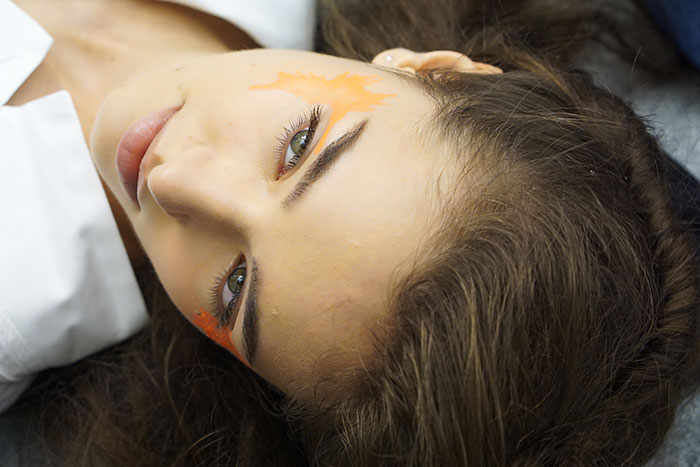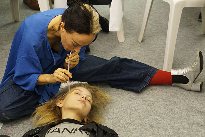 alex box issey miyake backstage with mac cosmeticsbackstage_issey_miyake_4She purposefully positioned the models on the ground so that the design would evolve and move like the roots of a tree and not upright so all of the paint would trickle down with gravity. This way the design would be more organic.