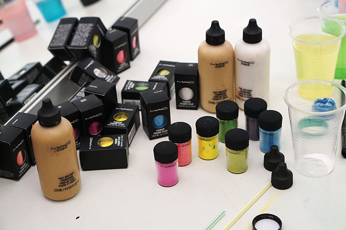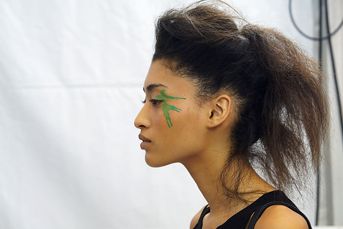 Backstage at Issey Miyake all eyes were on lead artist Alex Box who individually painted a beautiful eye design on every model that walked the runway. Leading the show for MAC Cosmetics, Box sat every model down on the ground and custom painted/blew an eye design using MAC’s Pigments. Alternating between bright colors she mixed the pure pigment with MAC Pro Mixing Medium Water Base then dropped them on the sides of the eyes blowing with a straw the access color so it created a unique design and then went in with a makeup brush to refine the look.