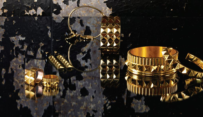 A REBEL is someone who stands up for their own personal opinion despite what anyone else says. An INDIVIDUAL who refuses to follow the crowd even if it means becoming an outcast. Jo Sampson’s Rebel collection embodies a spirit of nonconformist cool. Using the iconic motif of the punk stud as the heart of its design, designer Jo Sampson chose the stark, geometry of this simple shape for its enduring outsider appeal. The punk stud injects a tough, streetwise vitality to the pieces, which contrasts with the refined craftsmanship that goes into their creation. Combining golden metal with crystal in shades of plum, amber, blush, pink and purple, the Rebel aesthetic mixes the rough with the smooth.