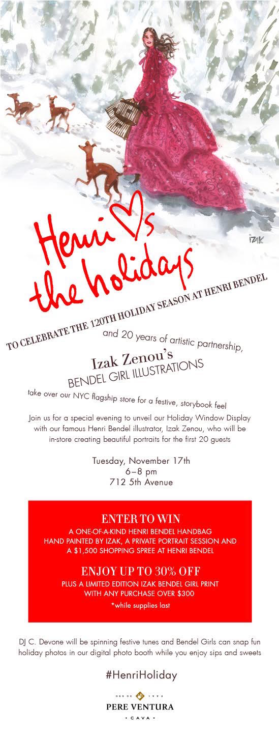 Tuesday night from 6-8pm join Henri Bendel as they unveil their holiday windows for the 2015 season next. Expect a stunning retrospective of renowned fashion illustrator Izak Zenou from floor to ceiling!