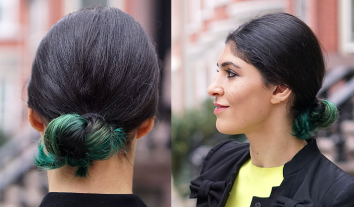 Step 1: Separate your hair into two even sections and tie it together like you’re making a knot. If you have short hair (like me) or want a very tight low bun, you can put your hair in an elastic first and then split it into two parts before making a knot. If you’re looking for something more ethereal, keep the knots looser and lose the elastic.