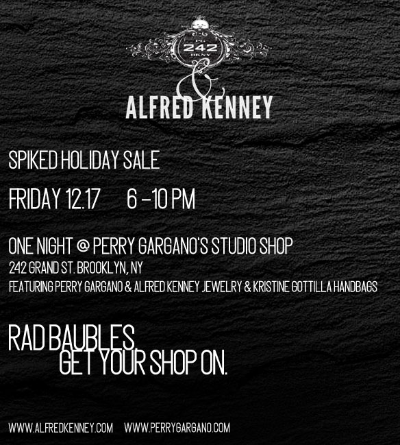 Last month, I posted about the launch of ultra chic jewelry line Alfred Kenney. Friday night (tomorrow), they will be hosting a holiday sale from 6-10pm at Perry Gargano’s Studio Shop in Brooklyn (Williamsburg). Have a drink, buy me a necklace and all will be merry! Okay fine, buy one for that special someone on your list. Enjoy!