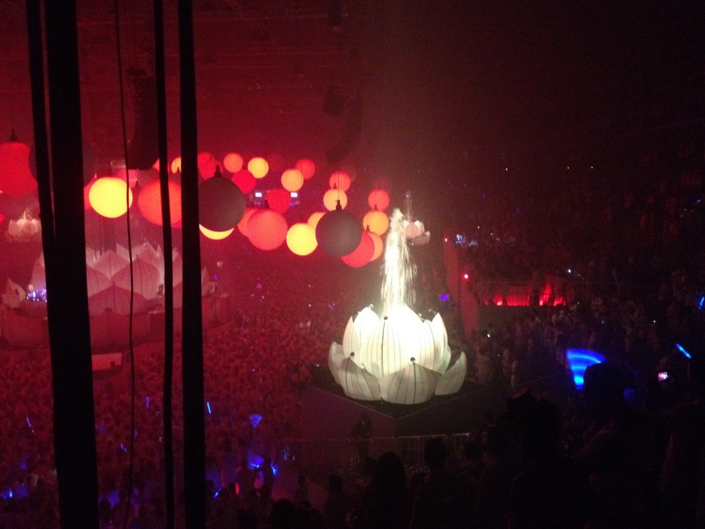 We walked onto the floor and it was this incredible view of thousands of people dancing around these lotus flower shaped fountains and DJ booth. You can see the theme of different elements pouring through the stadium.