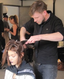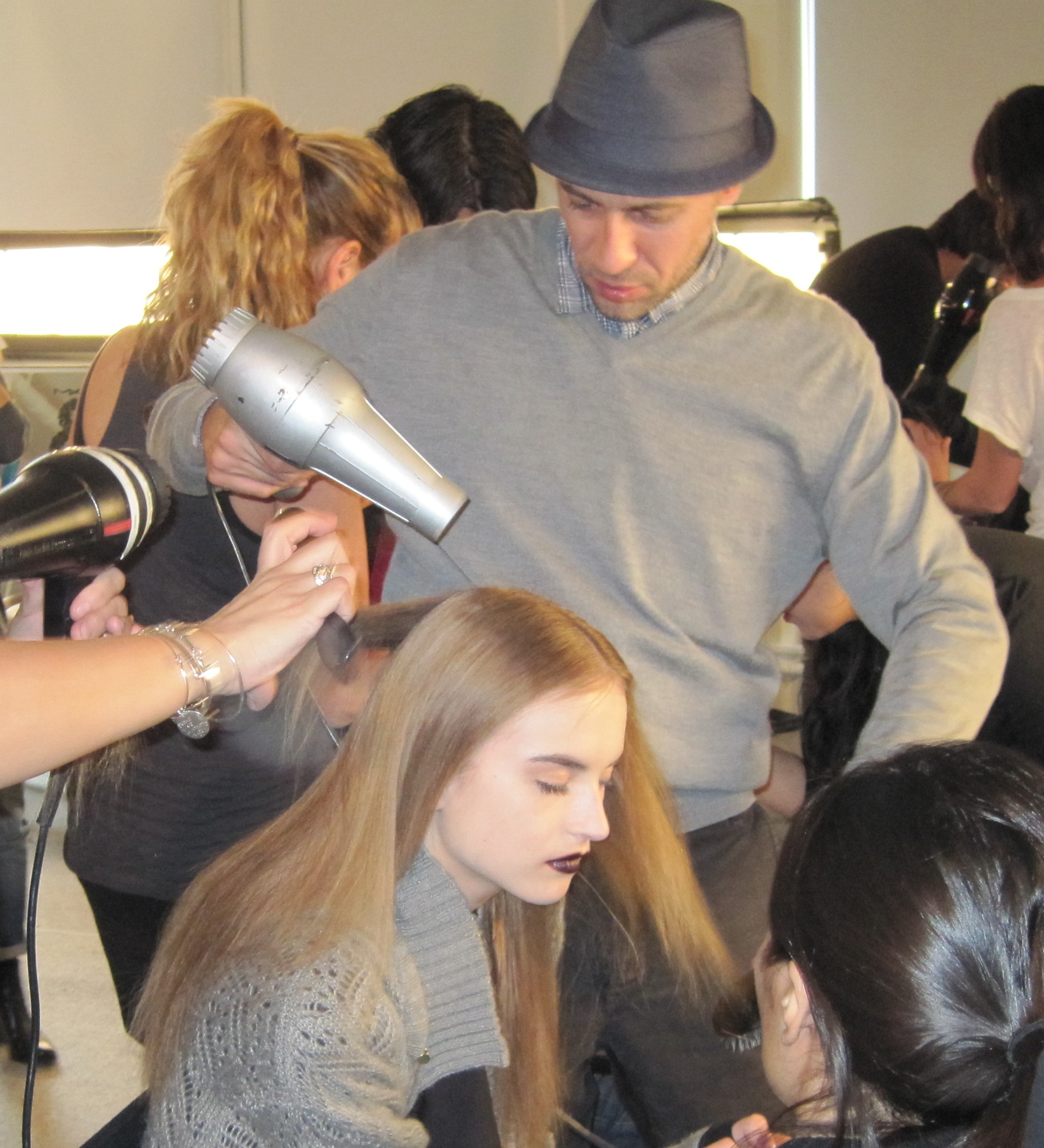 Inspired by the new Eastern European woman (from countries like The Republic of Georgia), hair stylist Rolando Beauchamp for Bumble and bumble, used buns, braids, and headscarves in bold colors to bring designer Alexandre Herchovitch’s vision to life. “Alexandre was deeply influenced by director Sergev Parajanov and his film ‘The Color of Pomegranates’. Parajanov was highly controversial and was even jailed for a time in the ‘70’s,” noted Beauchamp.