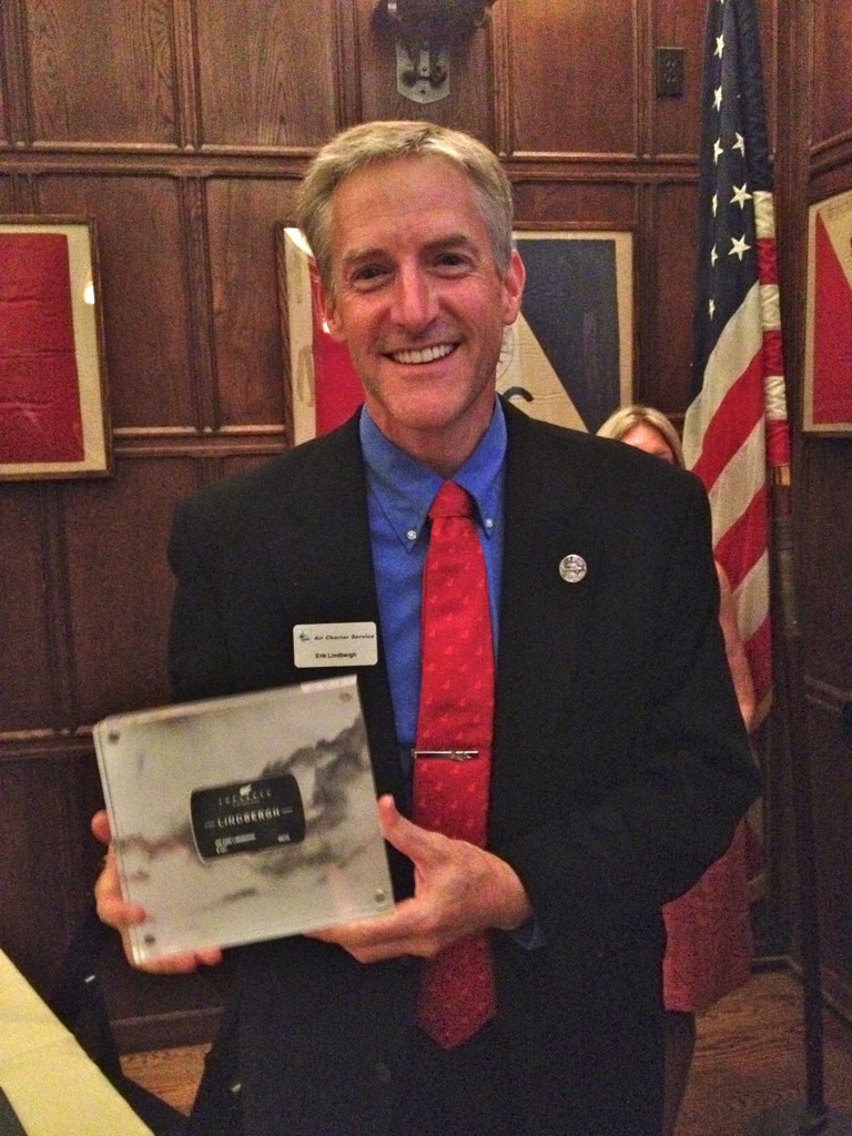 {Erik Lindbergh holding the inaugural Member #1 Lindbergh Card}