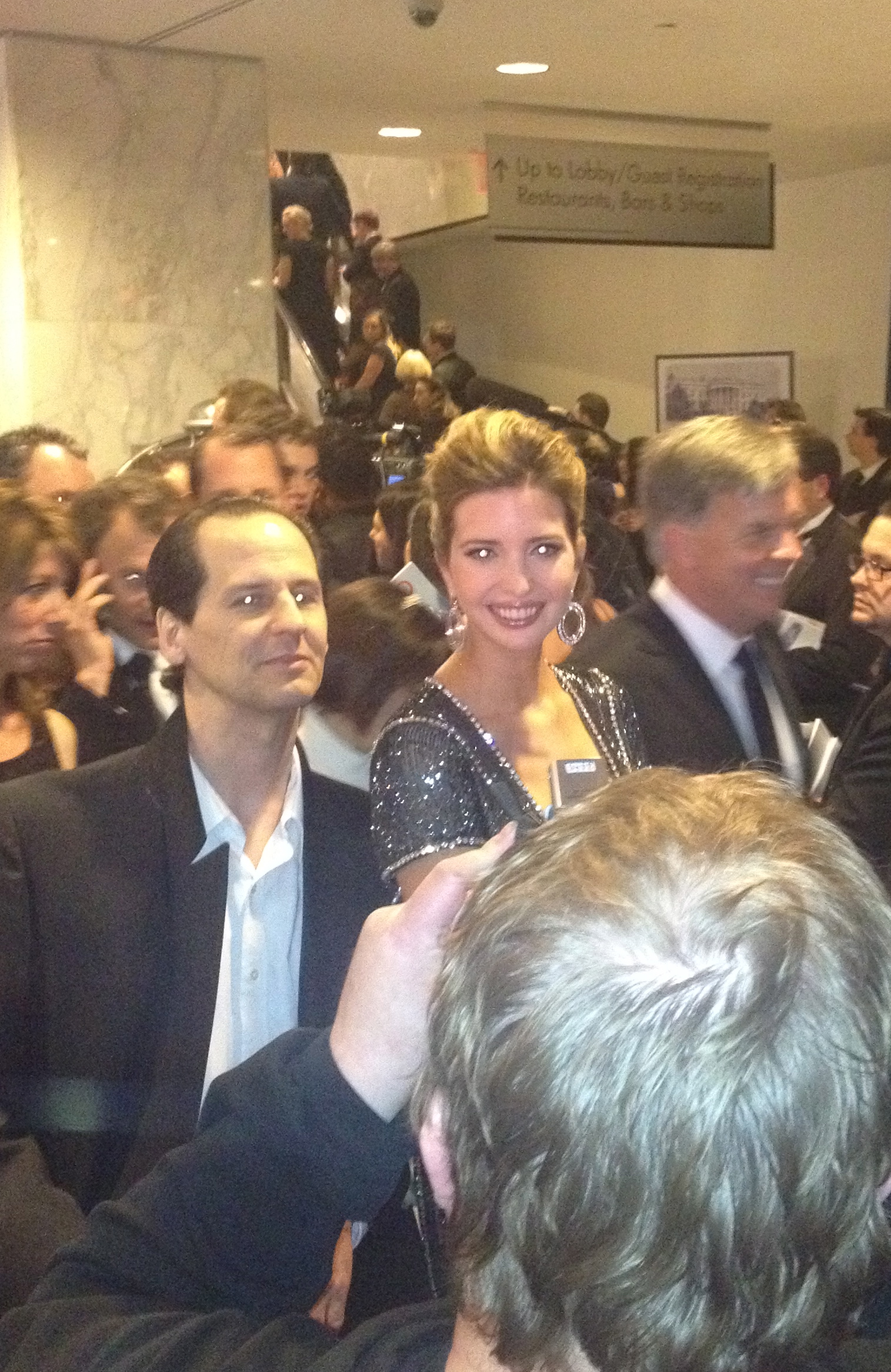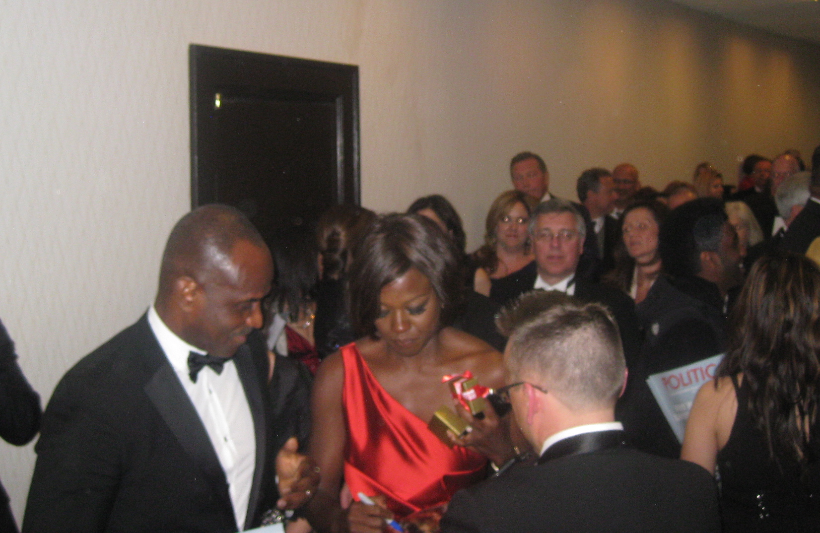 The cocktail party concluded and the dinner guests filed downstairs, while the rest of us formed a viewing party and had dinner upstairs in the hotel. It’s funny to eat dinner and watch Obama speak knowing he’s directly one floor below. Then once the dinner concludes we all regroup in the lobby, which is an even larger red carpet scene then the actual parties!