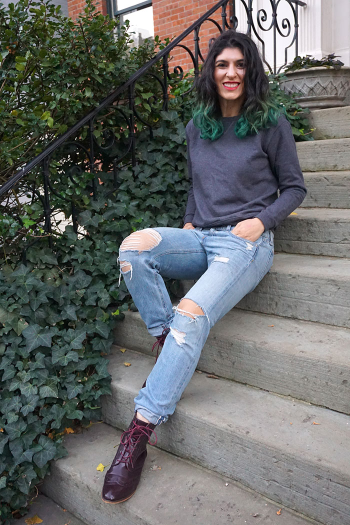 I know it’s probably a sign that the world is coming to an end when we’re hitting mid-60 degree weather in December but it’s hard not to be all smiles about how beautiful it is out. When I’m not running around to events I’m all about comfort clothing. A sweatshirt, some boyfriend jeans and a pair comfortable boots is the sign of a good weekend. I’m actually pretty obsessed with these Amos by Leila Stone boots. I’ve been looking for a pair of wine colored boots for a while and I got these during fashion week from ShoeDazzle. They are a pleather lace-up Oxford bootie so they can get totally rained on without an ounce of damage.