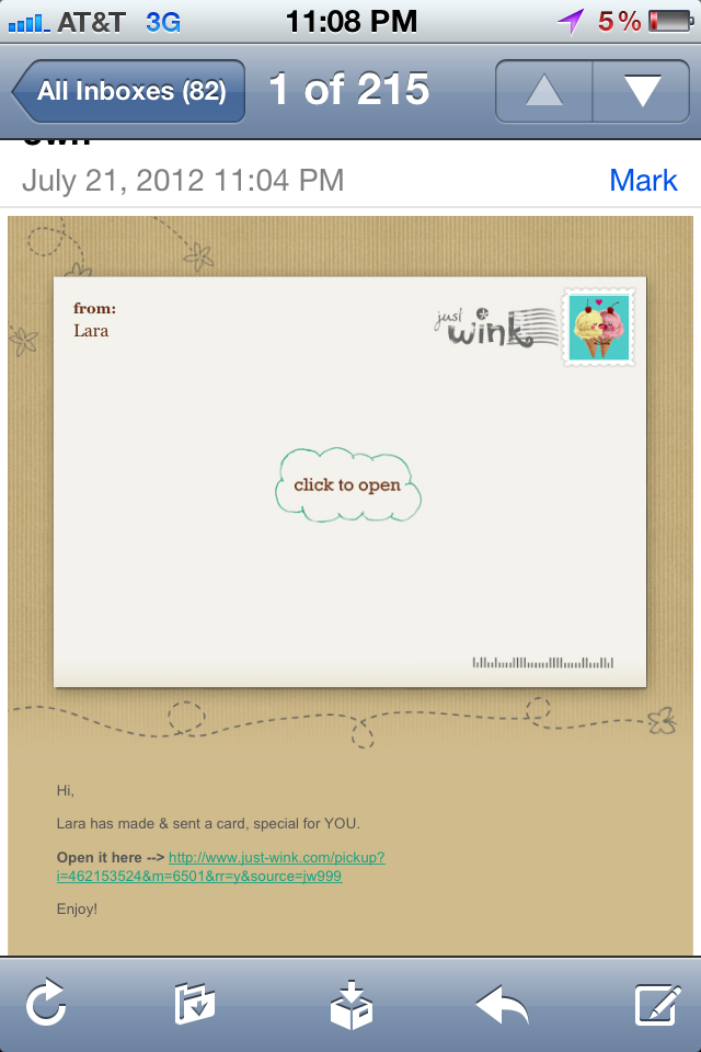I then hit “send!” And it gives you the option to email, facebook, twitter, text mst, real mail ($2.99)… I opted for email and look at how cute it is when it goes into the recipients inbox!!!