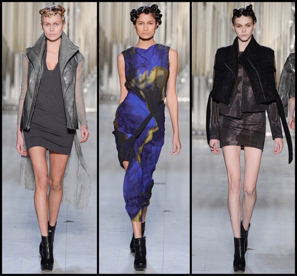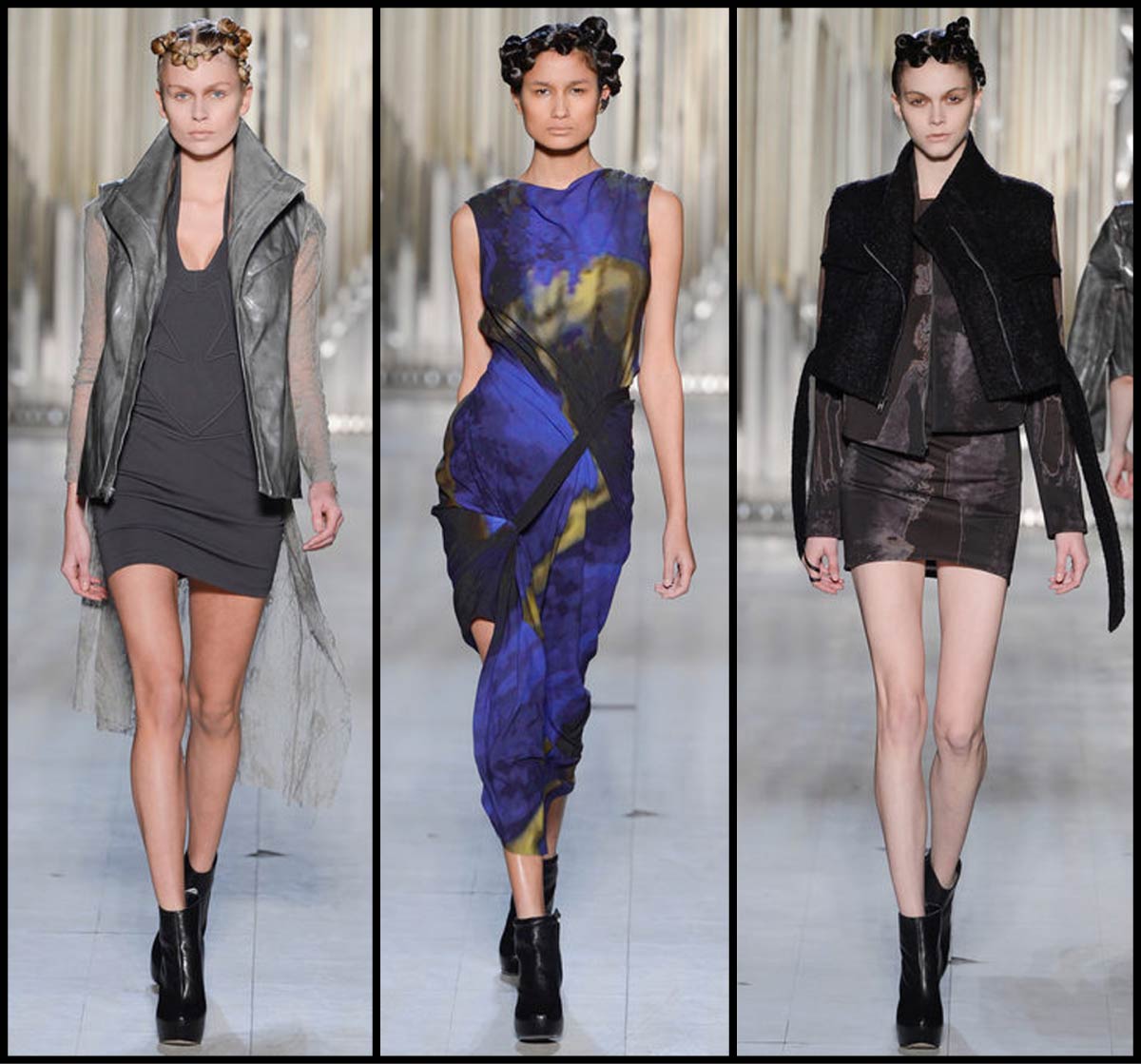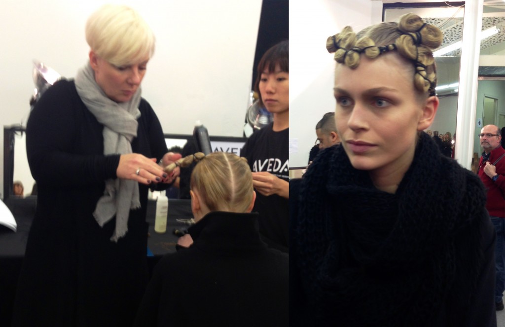 Backstage with Antoinette Beeders for Aveda at the Kimberly Ovitz Fall/Winter ’13 show she creates a killer asymmetrical corseted ponytails with milliner string. (This you can get a roll of at a local craft store for super cheap, its a 1/8″ elastic string used sometimes for corseting.) “This look captures the mood of Kimberly’s collection which explores the hyman psyche and innate defenses foun in animals and insects,” says Benenders. “I wanted to create a look that complemented the cloths – lik a shield of armor or an armadillo’s shell. The texture is smooth, and finish is shiny, but there is a veil of protection. Think of a 1920’s wave in a futuristic interpretation, just touched with danger.”
