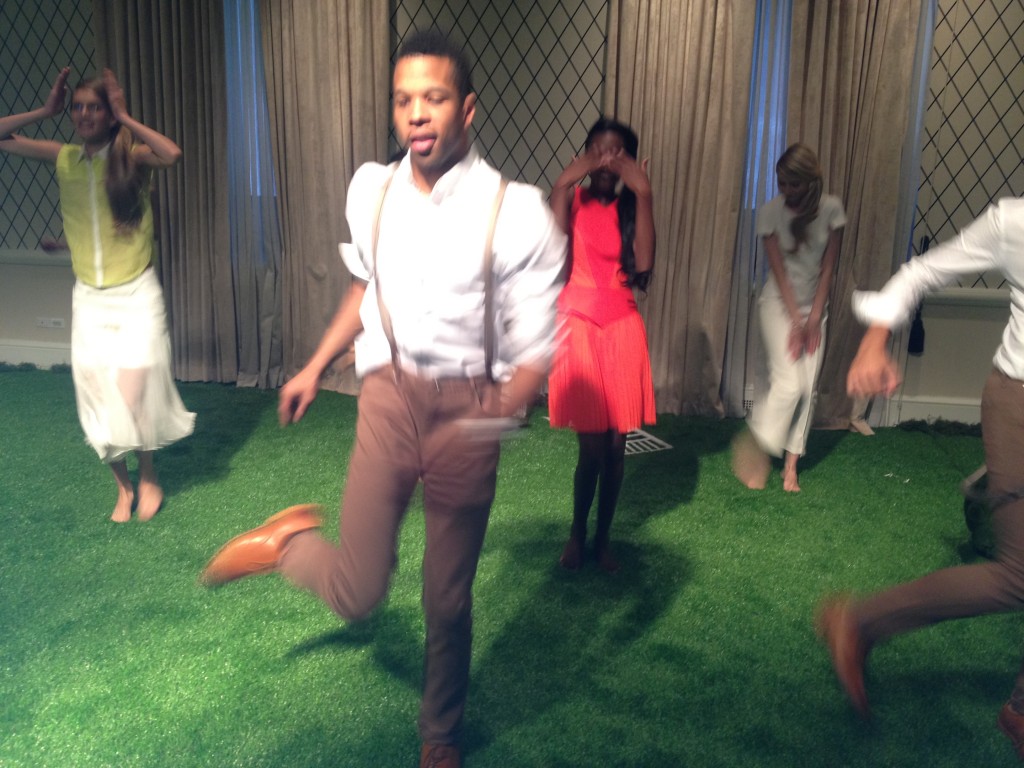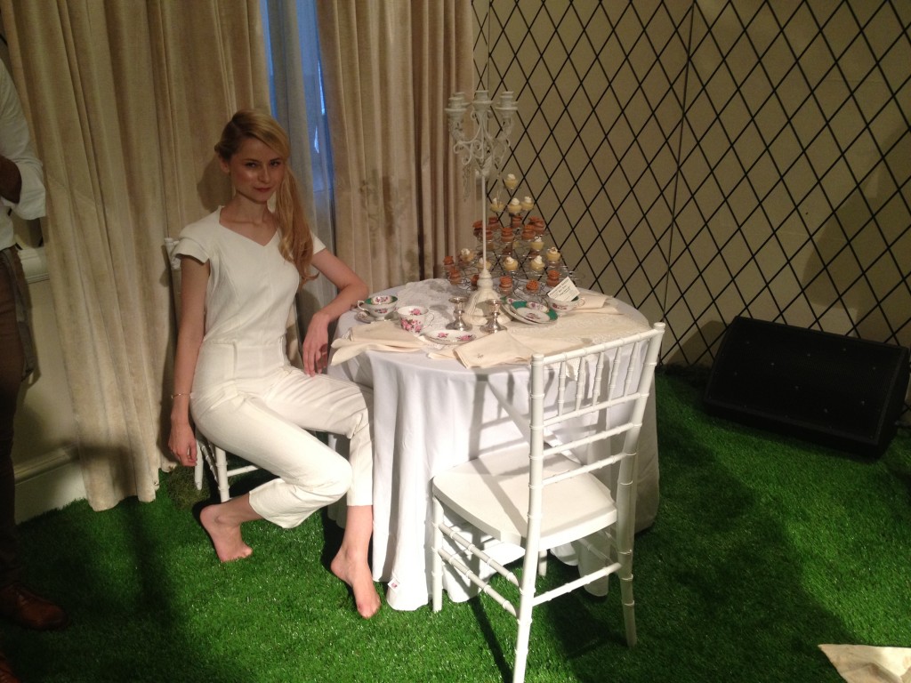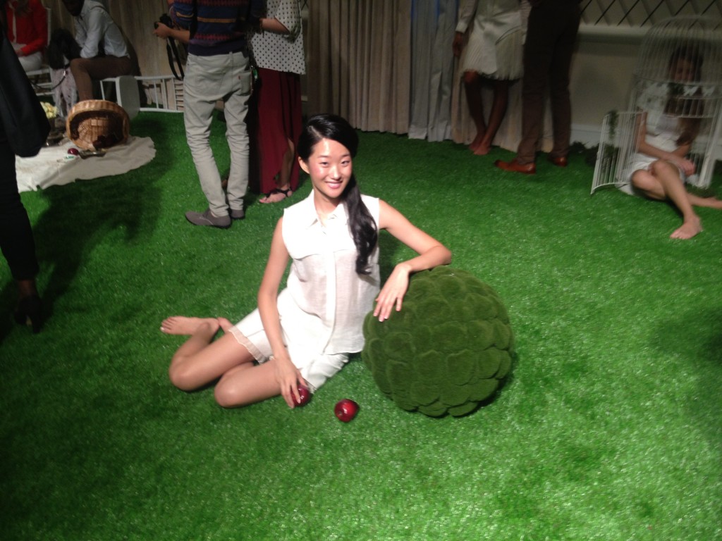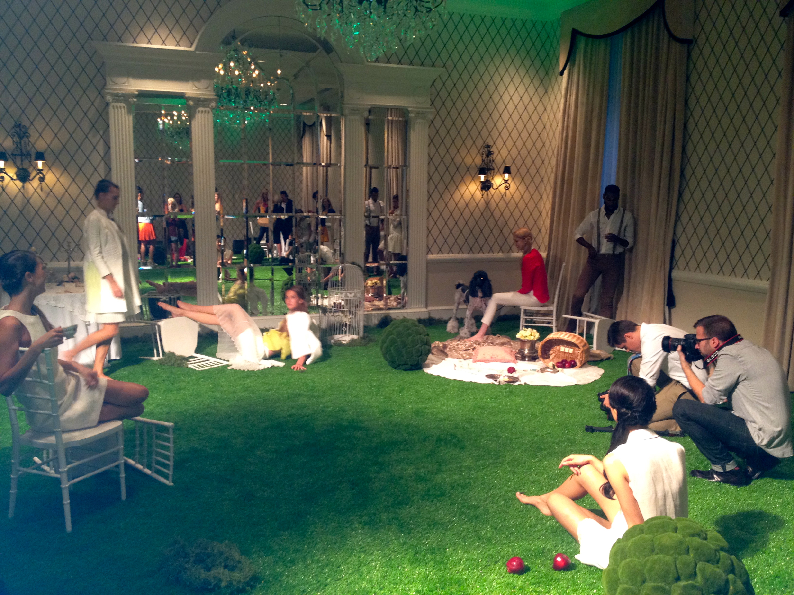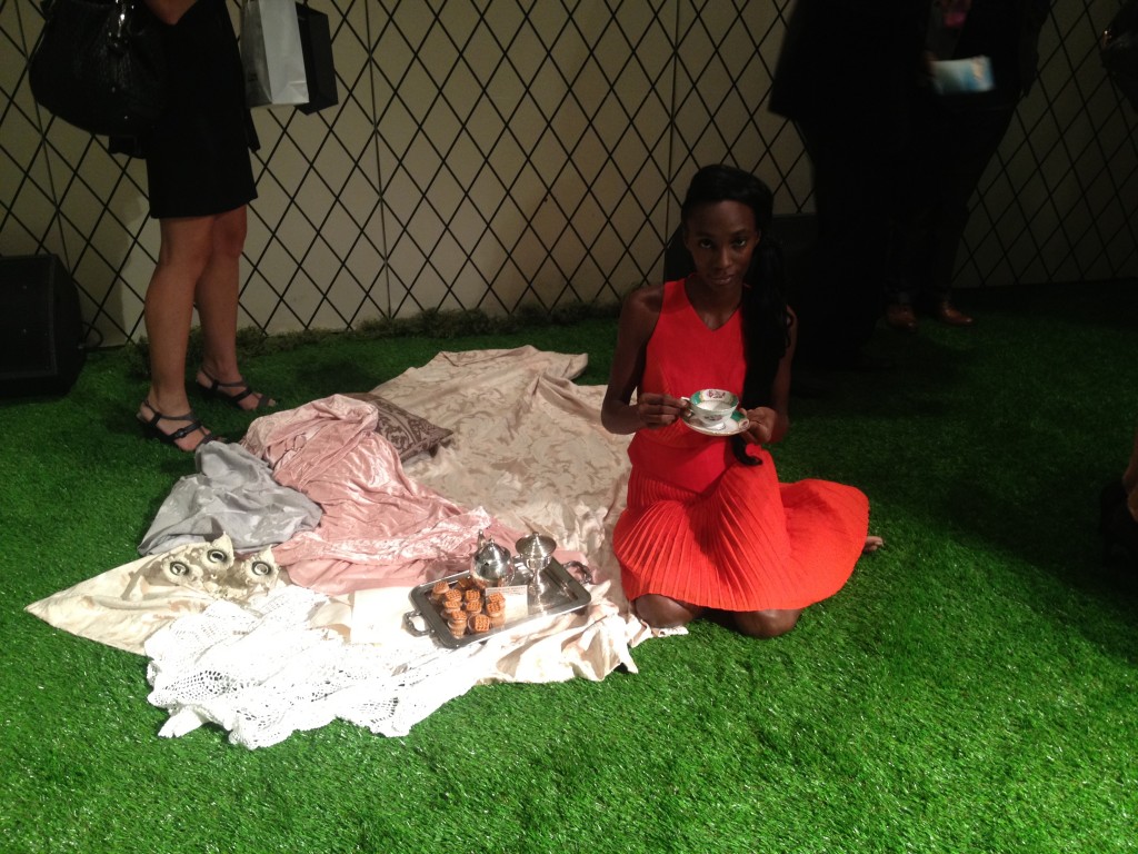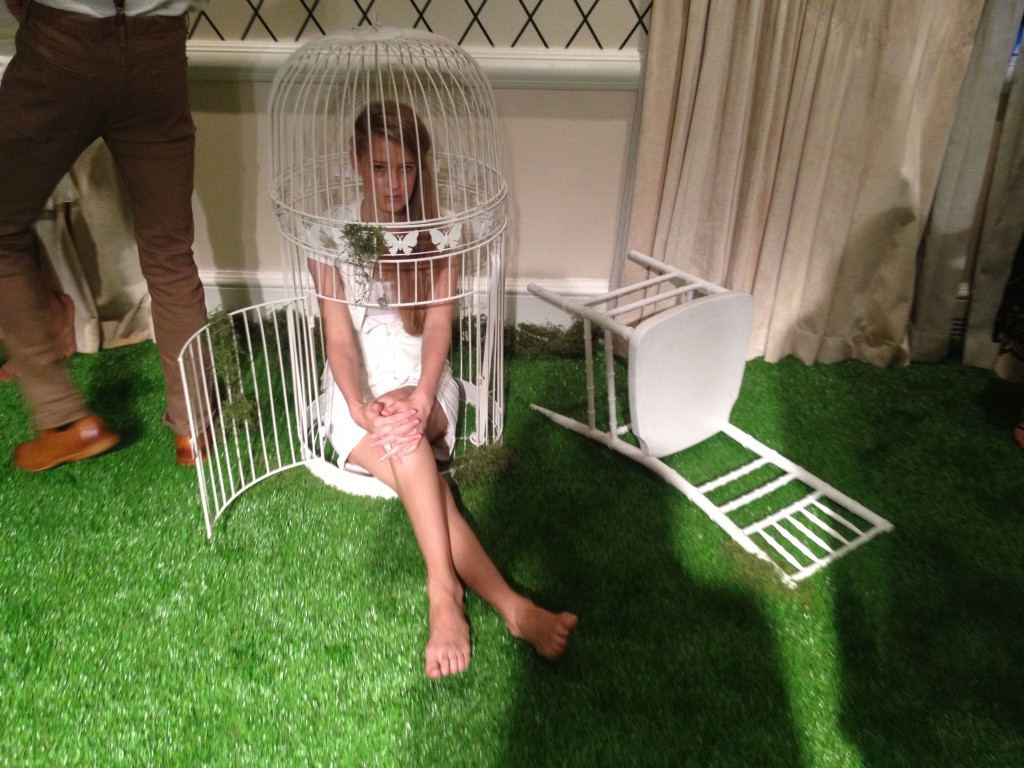I’m new to the label Kuning so I didn’t know what to expect when attending their Spring/Summer 2013 presentation. And after experiencing it, I’m happy to report it was easily one of the cutest and most creative presentations of the season (and I’m taking before we even start talking about the clothes). Major props the producers, this show was done so well. The invitation came in the form of a silver pocket watch (it was all very Alice and Wonderland of them), the layout of the models we’re styled with anything from vintage cages to picnic table sets – there was even a real dog (as in the most well behaved hound on the planet). And all of this was done in the Mezzanine of the Empire Hotel with grass (okay it was AstroTurf) overlaid over the carpet, but still! And don’t even get me started on the mini alcoholic cupcakes that the models would hand out when you entered their station – it was an incredibly interactive show. The highlight being every 15 minutes the models would break into a routine dance that not only helped show the movement of the clothing but added such energy and fun to the atmosphere.