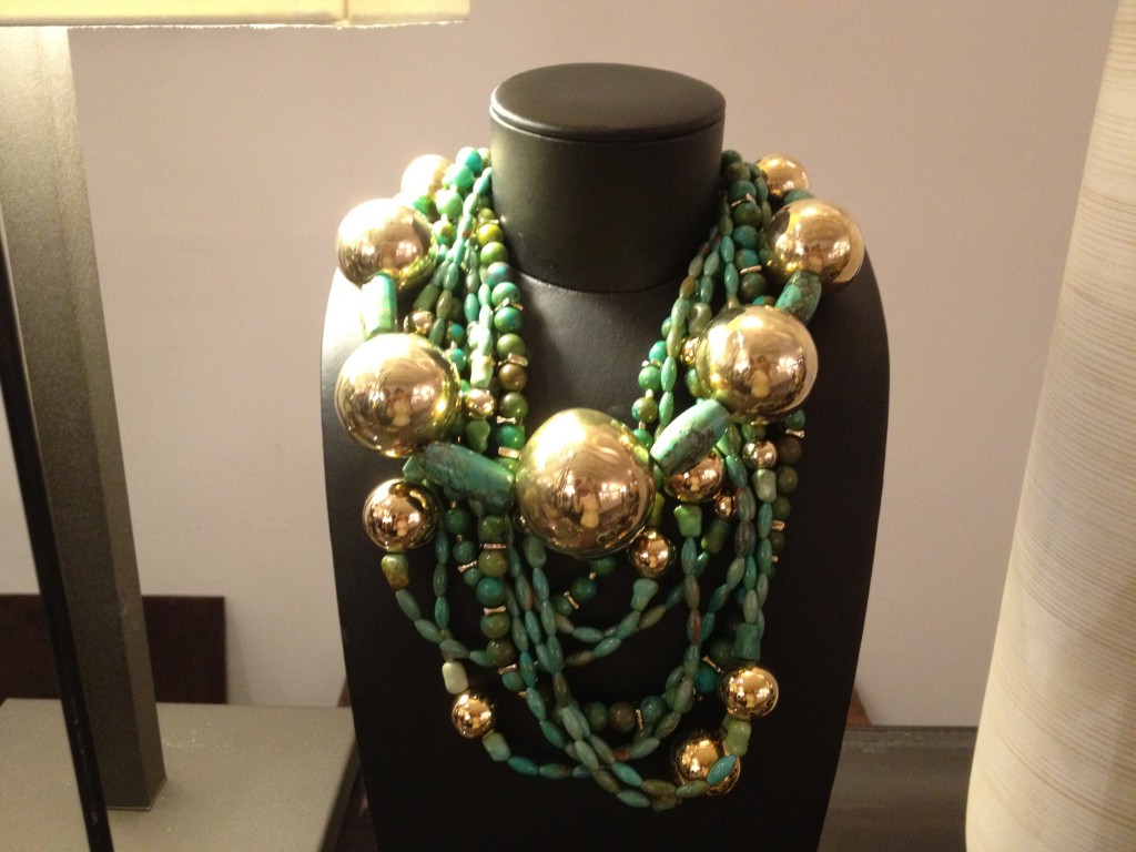 The spring collection was nothing short of a work of art. His jewelry, all distinctive and unique statement pieces featured these incredible cuffs and bead with medal combination necklaces. The green/gold contrast is something to admired.