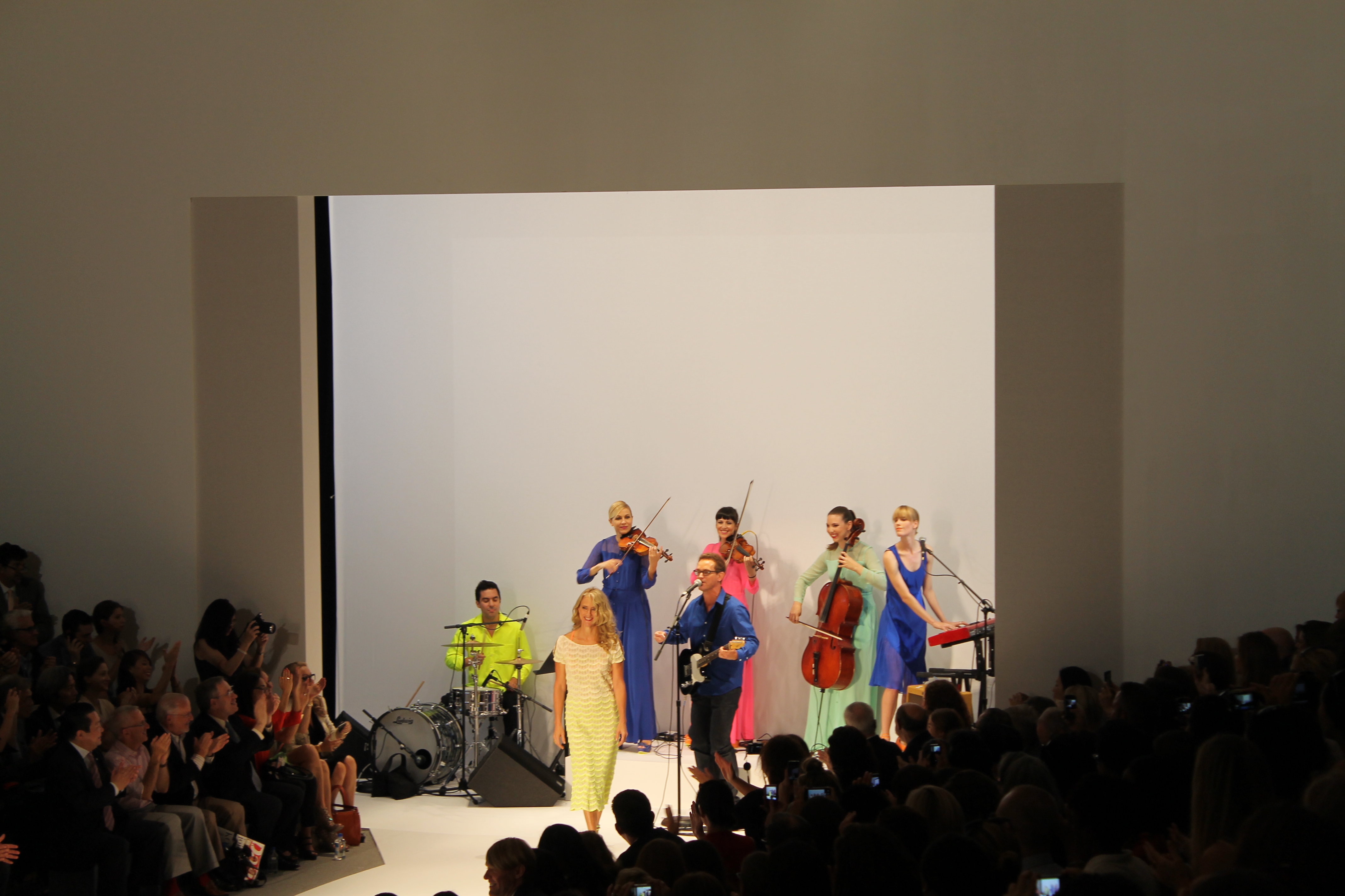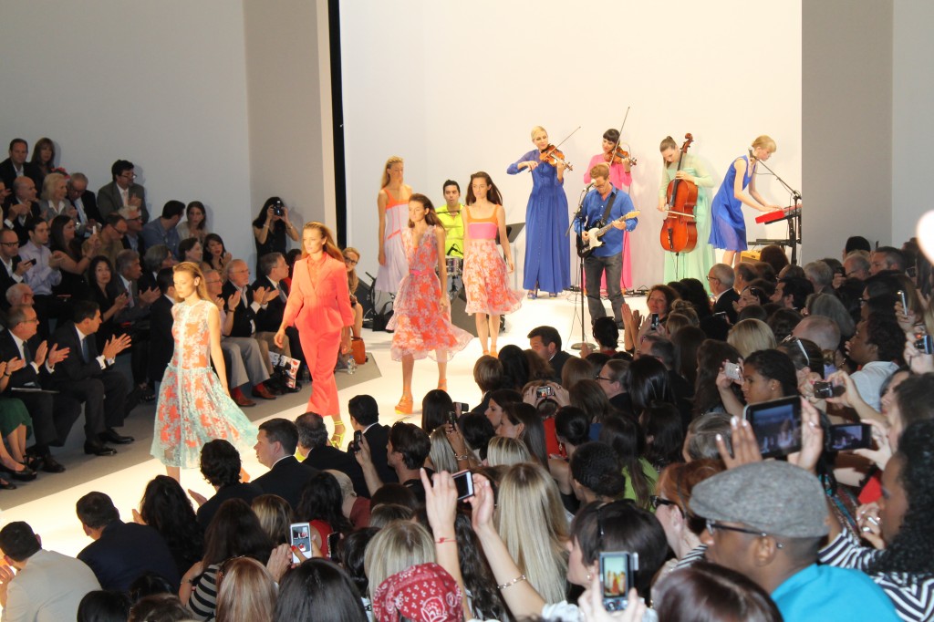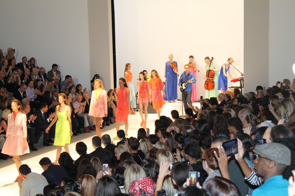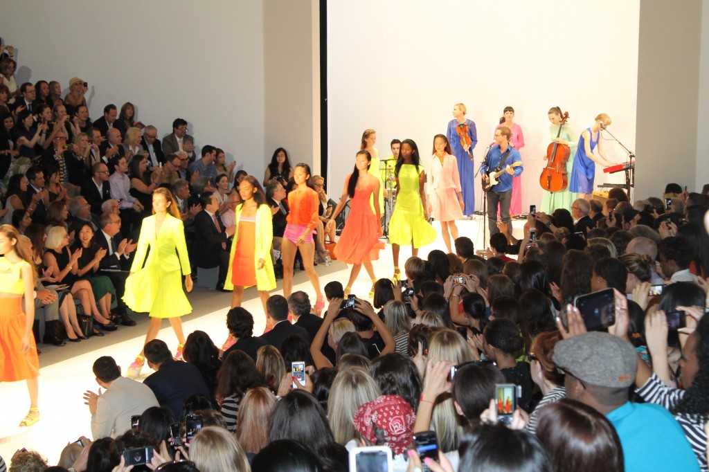 Nanette Lepore’s Sping/Summer 2012 show was filled with energy and bright colors. In a growing trend of live music having a presence on the runway, Nanette Lepore collaborated with singer/songwriter Sam Bisbee for a performance during her show. “I love when people incorporate classical instruments into something hip and modern,” said Lepore. Premiering music from Sam Bisbee’s “You + Me = Us” album, the models rocked the collection filled with hot pink, bright yellows, orange and electric blue.