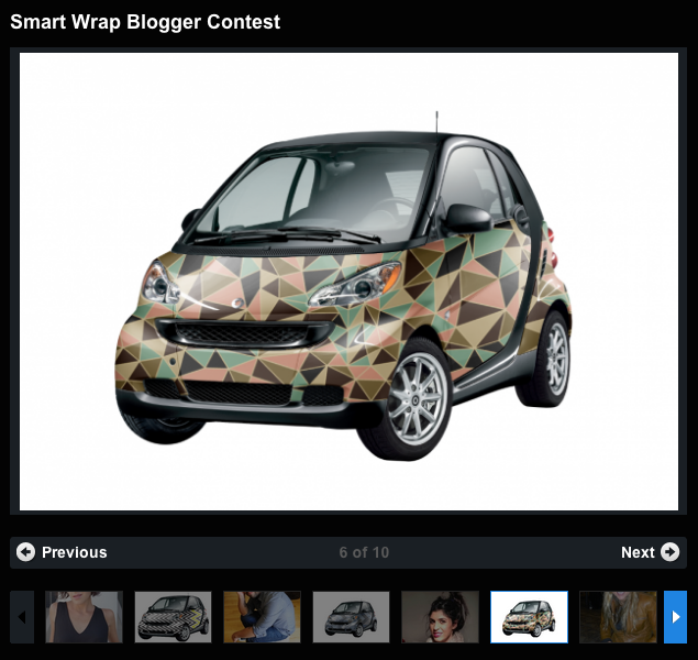 Currently, our cars (wrapped in our designs) are up on the smart USA Facebook page. You can log on and vote you favorite for your chance to win a MacBook Pro wrapped in the winning design. The winning blogger also gets a computer wrapped in their design so I would really love your support!