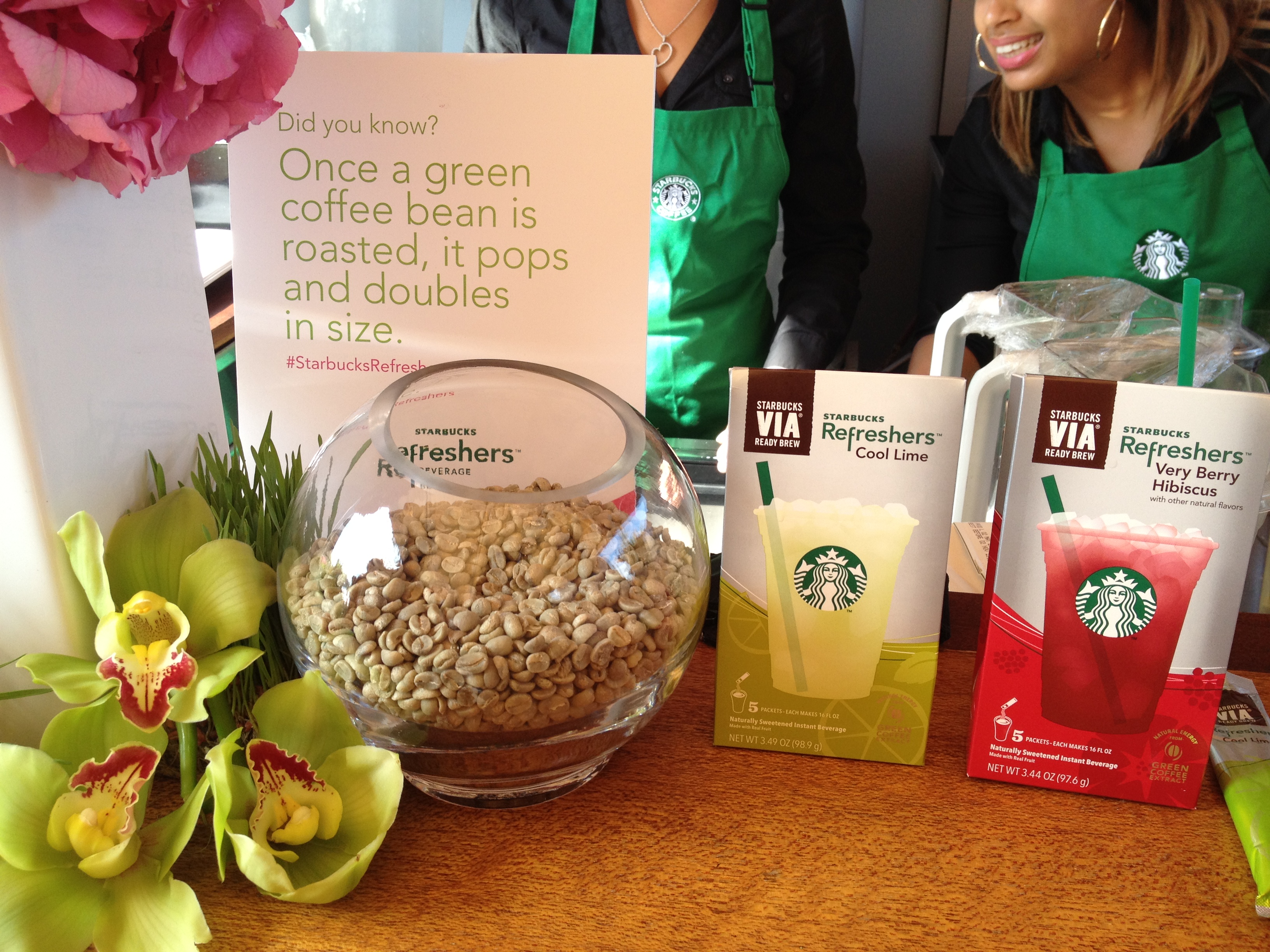 Last night I went to a summer soiree hosted by Starbucks in celebration of the national launch of their NEW Refreshers beverage. This product is B-A-N-A-N-A-S! (Figuratively not literally.) It actually come in two flavors, Very Berry Hibiscus (my preferred flavor) and Cool lime and despite tasting closer to refreshing flavored lemonade type beverage, it’s actually coffee. Naturally caffeinated from green coffee extract (which offers about 1/4th of the amount of caffeine as regular coffee), Starbucks Refreshers combines real fruit juice to make this the perfect afternoon-pick-me-up. They have 100 calories and contains 50% of your daily value of Vitamin C. Prices start at $2.90 for a Tall size (12 fl oz.).
